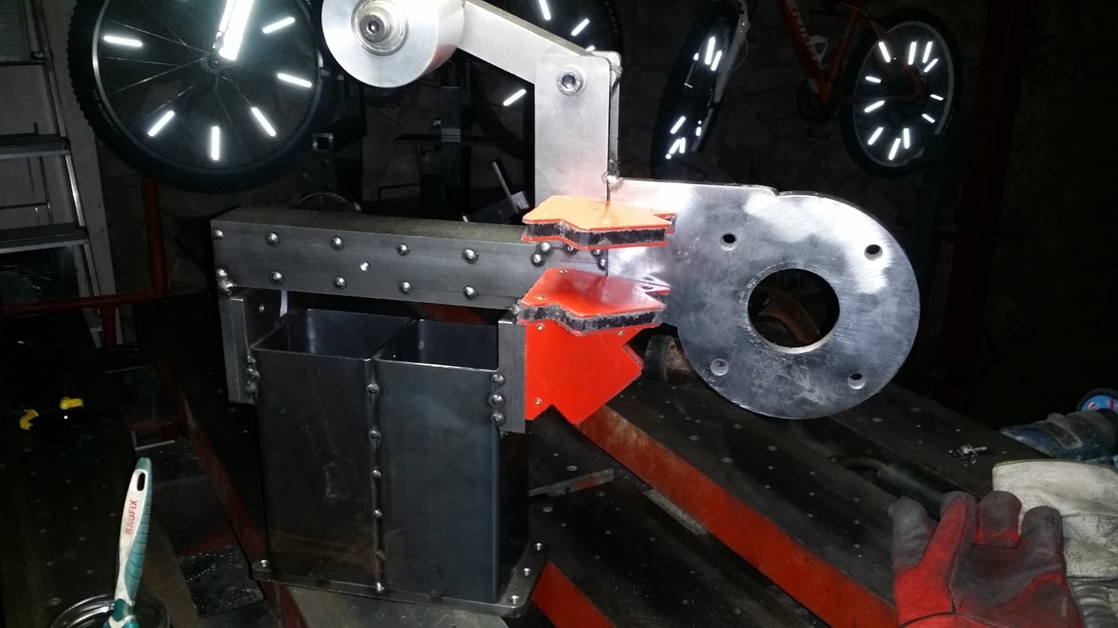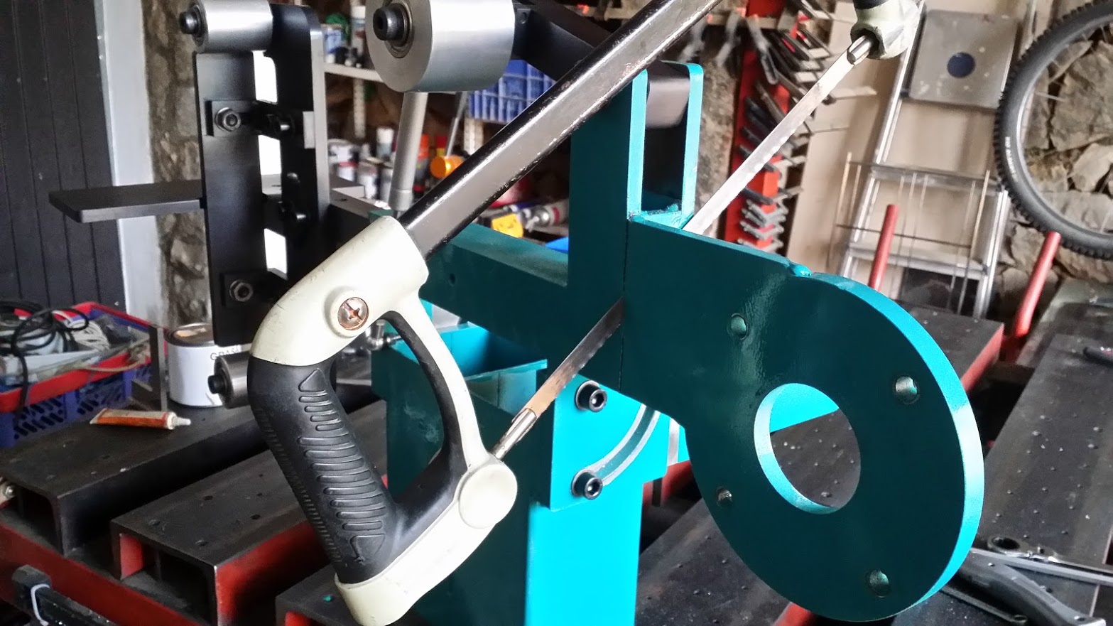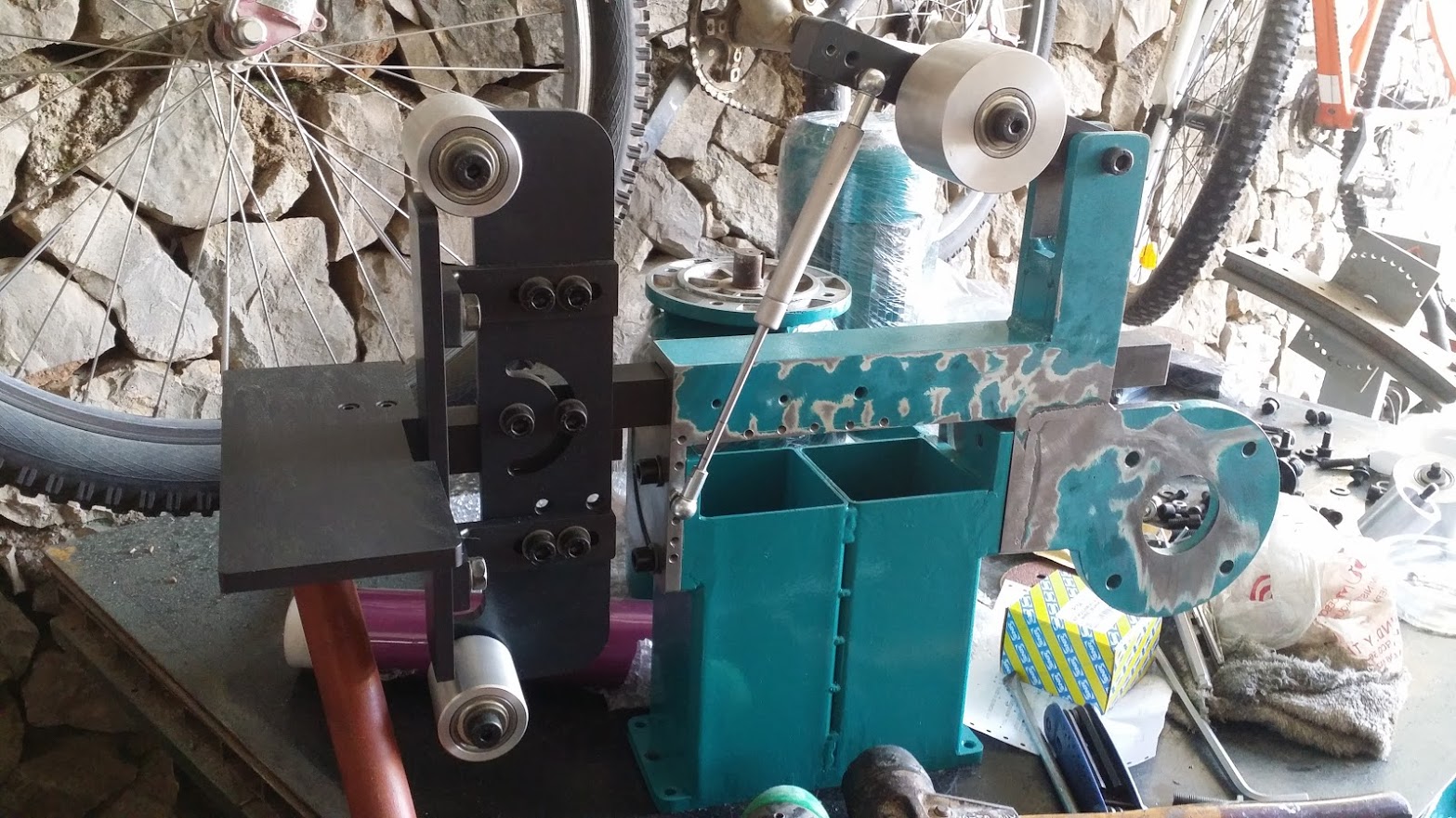 I finally was happy with the result, so version .01 was born On right picture is Jeffs grinder, we left his motor as he does not need it for making knifes so no future attachments.