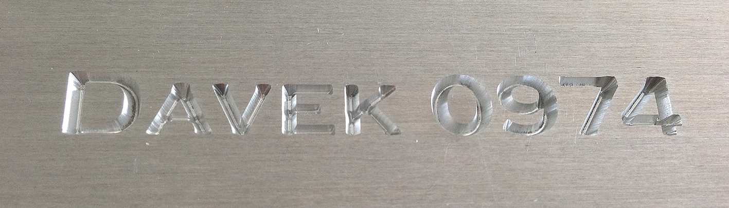 Following assistance from John S (thanks John) I have done some more engraving, this time using code generated in V-Carve and using my 3mm 30deg 0.2mm carbide cutters, the results were mind-blowing - razor sharp lettering, no burrs on the edges, could not be better and proves the machine is totally capable of detail work...