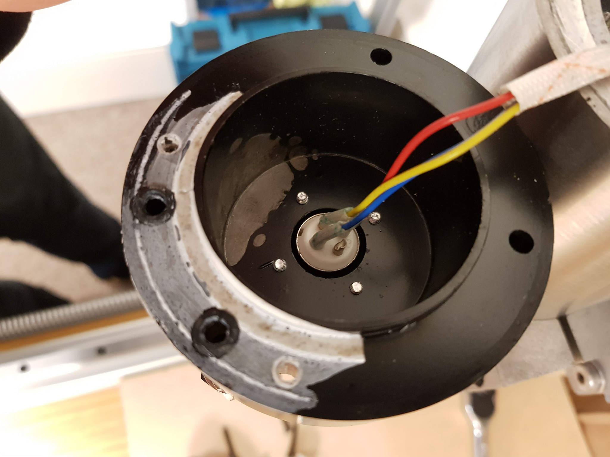 I started looking today about how i need to properly Ground the Spindle at the VFD side, whilst looking for information i came accross a forum post on CNCZone that said many of the Chinese spindles do not have their Ground pins connected to anything inside the Spindle, so i decided to take the top off and have a look - and not much of a surprise as the Ground pin was not connected to anything. Where can i connect this to? Should i just drill and tap a hole so that a connector can be screwed to the casing and soldered the correct pin?