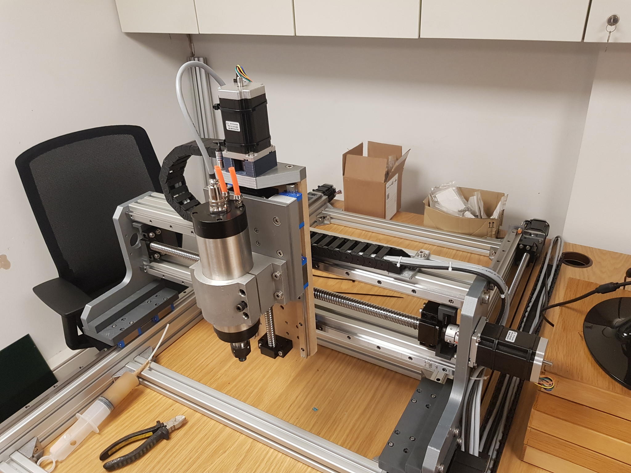 Anyway, it is really a very nice machine you are building. The only thing I notice is that you seem to have made the same mistake I did regarding the Z plate. The linear bearings should be the other way round, the rails moving up/down and the bearings fixed. If not too late you should change that. For me it is too late now, but it sure will be the first thing I'll correct next time I upgrade my CNC.