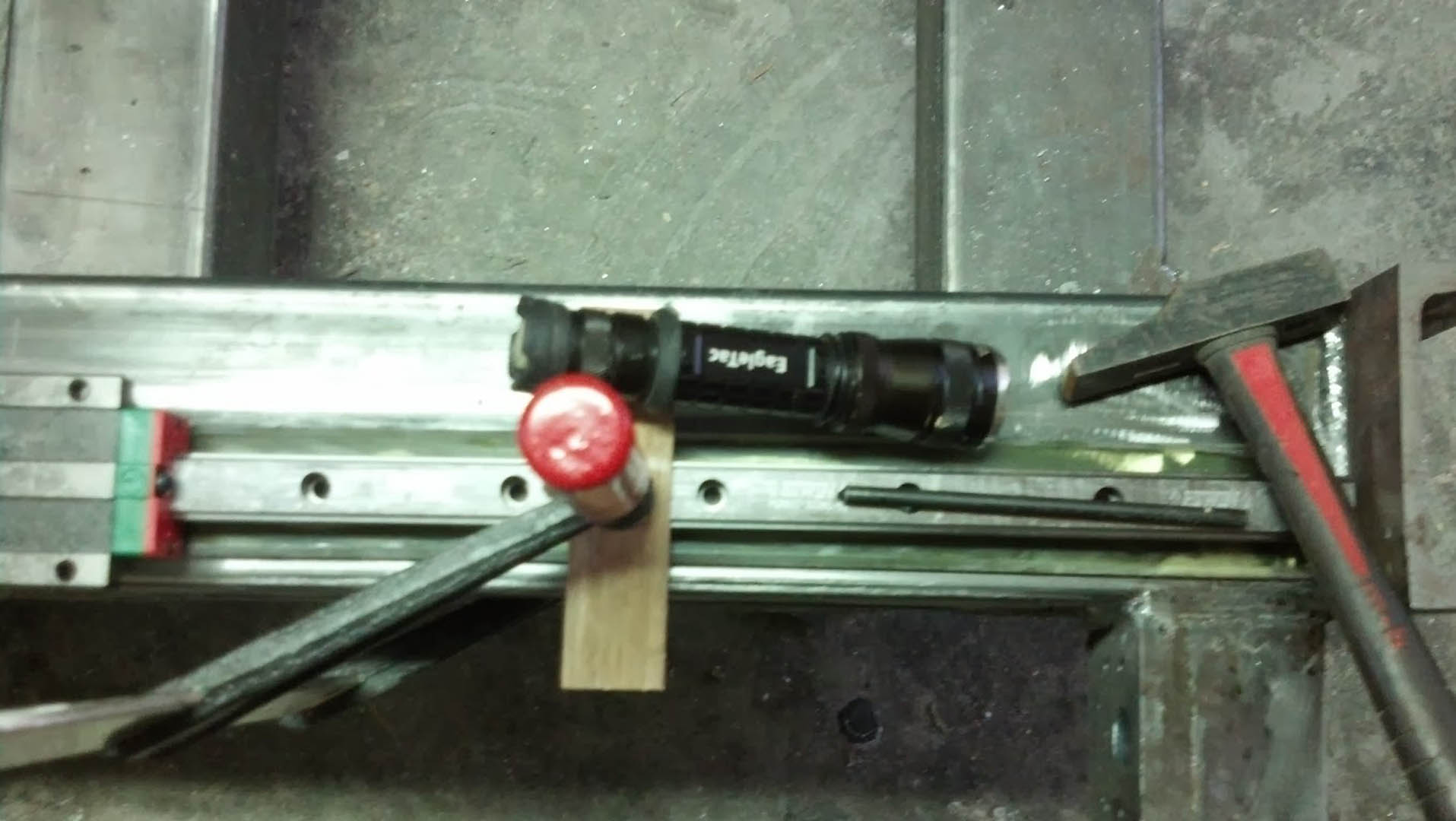 I was tired and working after work. But i wanted and started to feel a kind of satisfaction not being in a hurry and doing things right. So instead of drilling through the clamped hiwin rails, i used a hole transfer tool lightly using the hammer. And a torch, to see better.