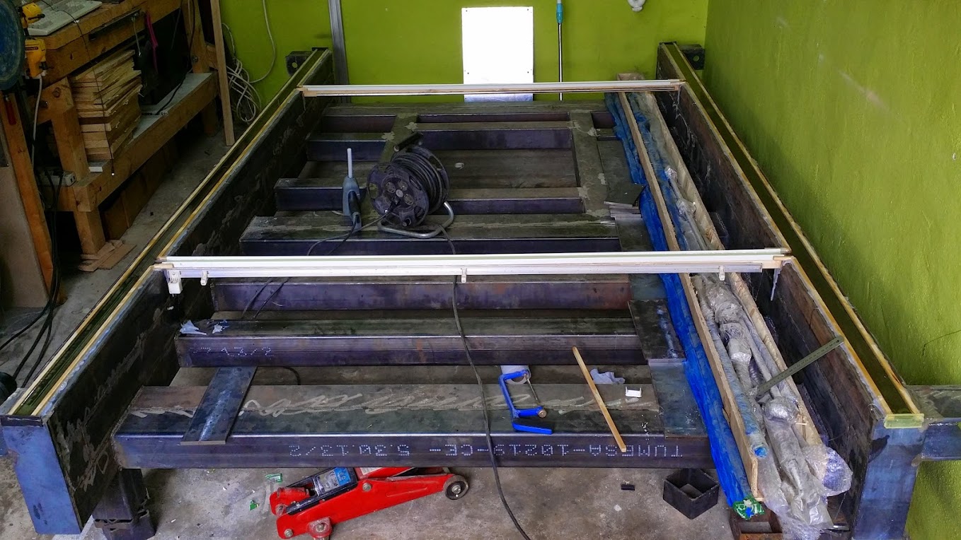 As i carefully welded the frame and a couple of times leveled the structure, the depth is 4-6mm . If i do it next time all will be steel, dam 10x10mm welded , channel >45mm wide/cause will hit the bearing blocks other wise. perfect will be 8x8mm bar. Clean, fast, beautifull. No finishing needed and most of all on such a big table water can be applied earlier so level it perfectly. Before pouring i mean.