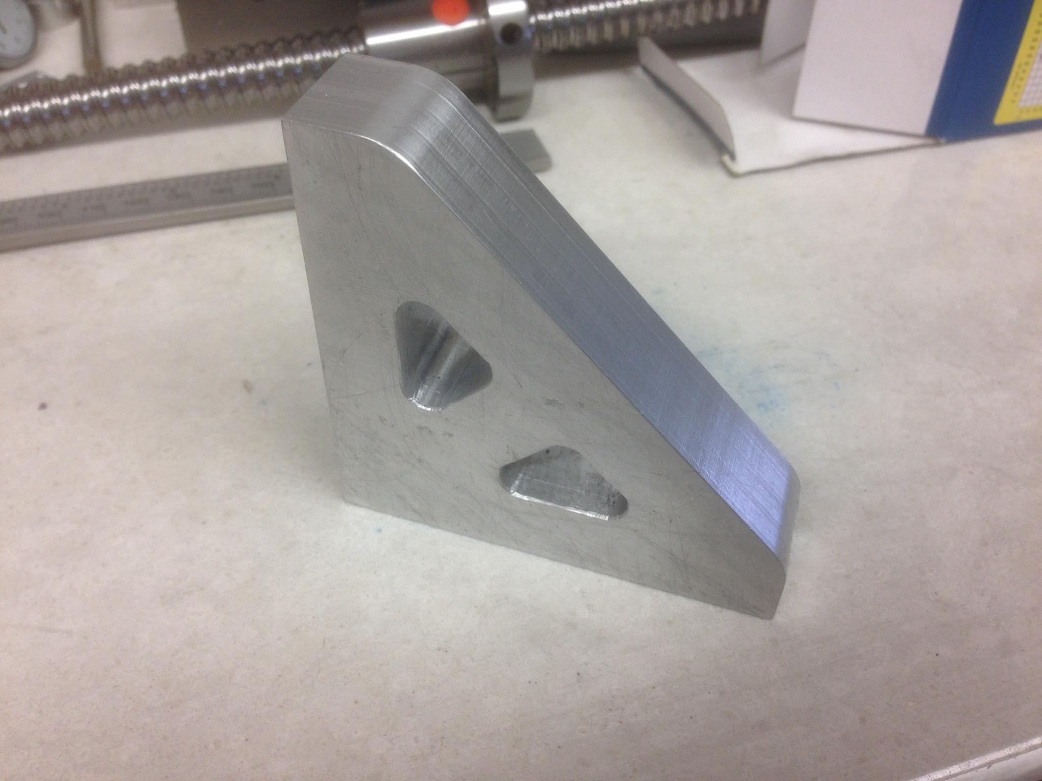 Next parts were the triangular supports. No photos of these being machined as I wasn't happy with first one. As the design was just a simple triangle I used tabs to hold it in place. But these left the usual witness marks on one edge which didn't look very nice. I tried to sand them out but wasn't happy.