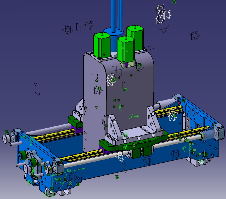Here is the current design for the Y/Z axis. You can see the tram plates (small grey rectangular plates) I mentioned earlier which will allow me to tram the spindle relative to the larger green bearing plates underneath.