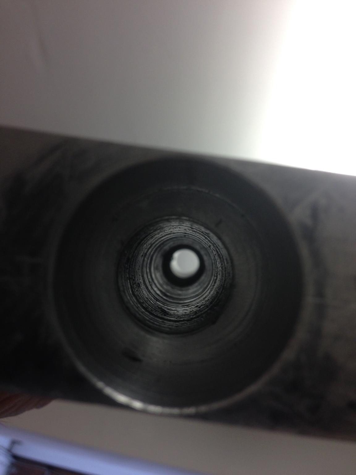 Problem with that was that the drill bit was not quite long enough and left a small ring of aluminium where the 2 holes met (the blank ring about half way down the hole):