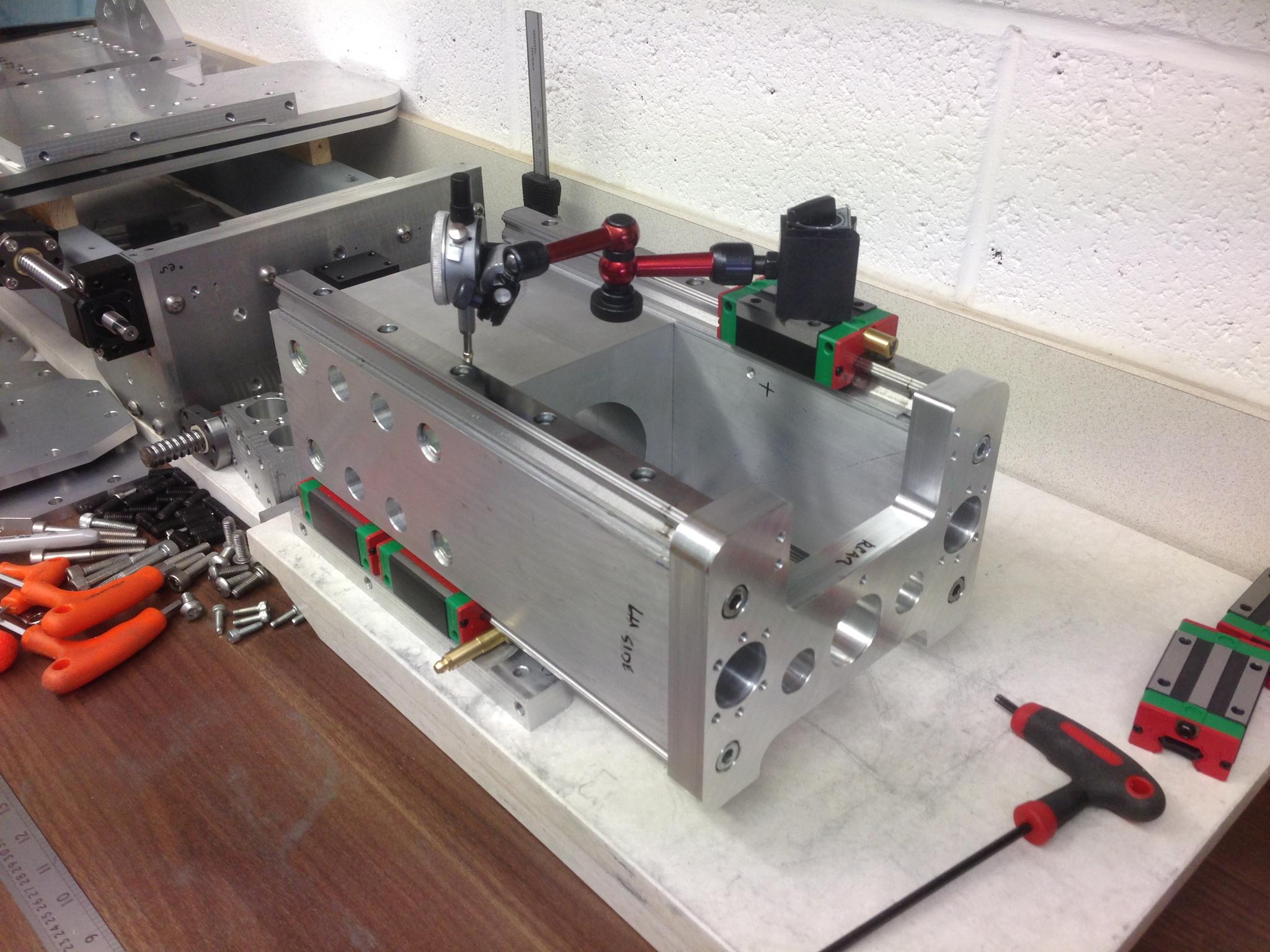 Then checking the vertical alignment showed that the 2nd rail was ~0.05-0.1 high towards one end. The large side plates they sit on will need the M12 bolts loosening and knocking round slightly when this goes together for real.