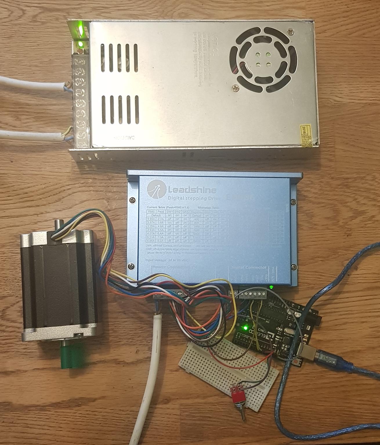 Simple setup with a 48VDC power supply I had lying around and an Arduino to generate the pulses. Always nice to see a stepper womble back and forth, and it means as soon as my mechanicals are ready I can test the steppers in place without needing the control system finalised.