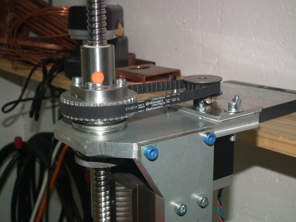 A replacement spindle motor mount was made to move the motor forward sufficiently to clear the ballnut and pulley assembly: