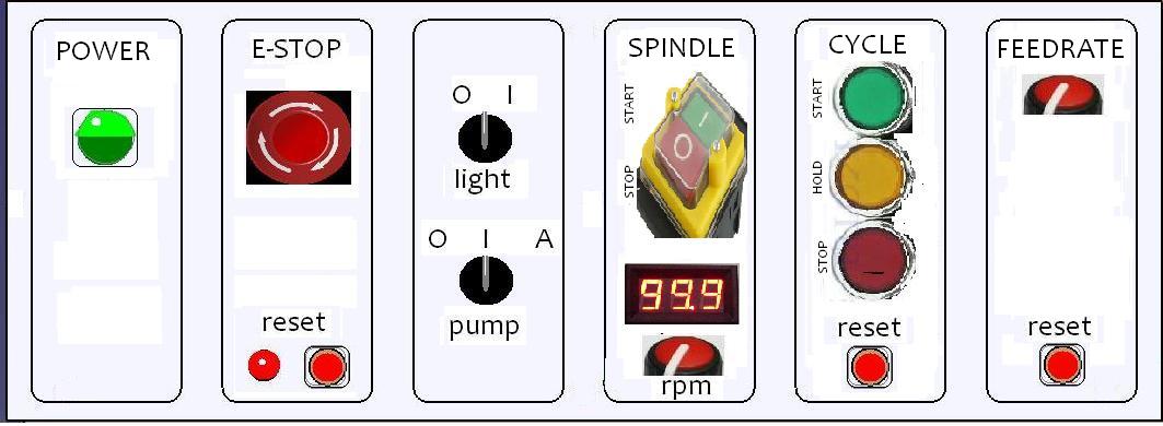 My buttons are laid out in order of running sequence left to right. Power on, then e-stop reset to energise the relays, then switch on lights and pumps if required, then start the spindle and set the speed, then run the cycle, with a feedrate override tuning dial right at the end.