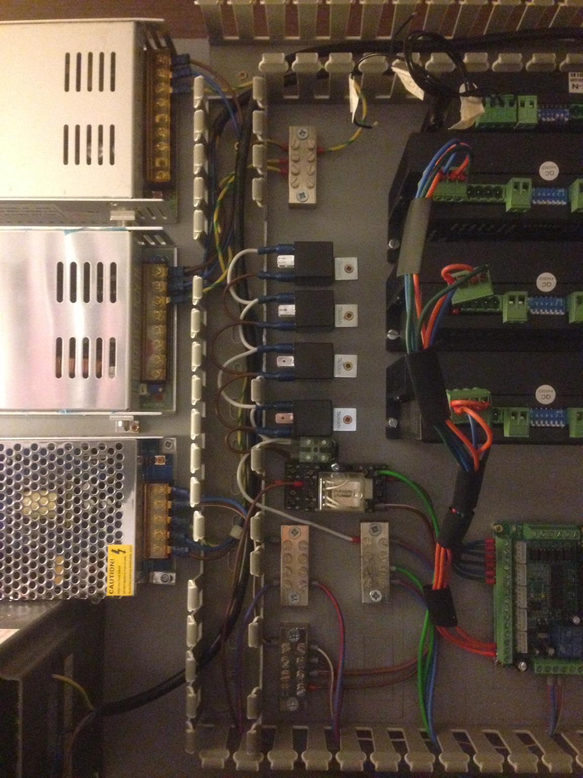Wired up the safety relay and the 4 slaves, plus the panel e-stop, the e-stop reset button and e-stop red LED. Triple checked all the wiring, stood back, held my breath and switched it on at the wall. The PSUs came on and the BOB came on.