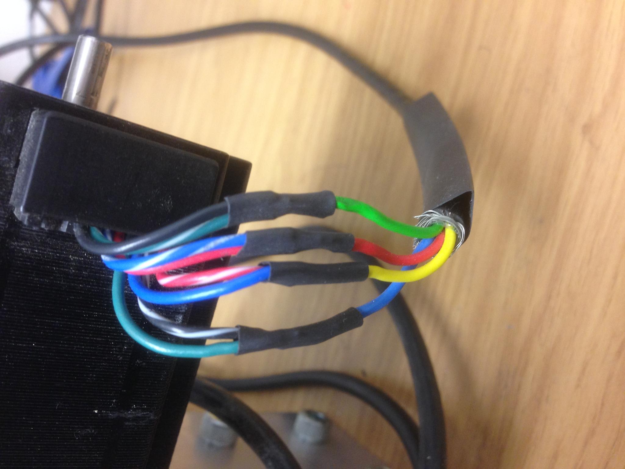Got the main panel on the wall and wired up all the stepper motors. I have changed over from series to parallel connections (on the X1,X2,&Y motors) to take advantage of the higher current available from the new drivers. I decided to solder and heat shrink the cables at the stepper motor end and dispense with the choc-block. One less terminal to come loose. Here it is before the final large heat shrink was placed over the cables: