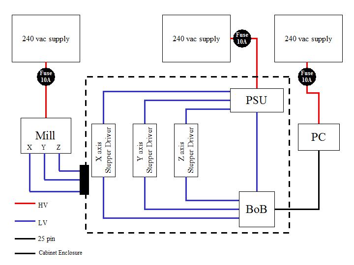 You are using the 36v to power the steppers and the 5v to power the breakout board, you also have a 24v supply in there for the Pilz ?