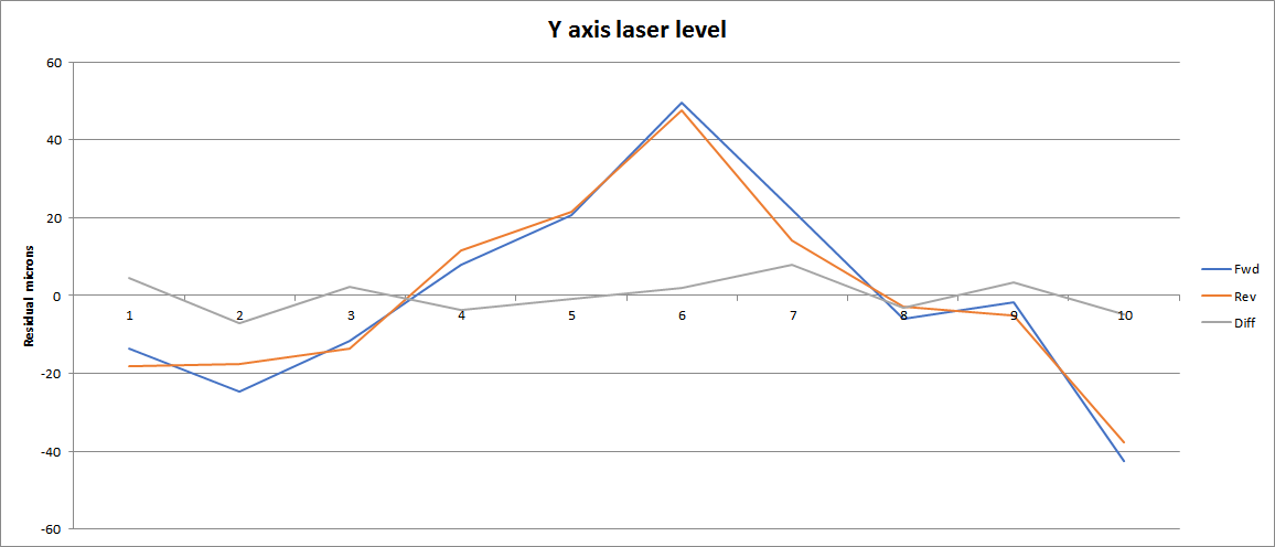 So I ran another set of tests directly on my granite island without the gantry, all tests were with the cheap Bosch laser. I ran 3 tests, each measuring 10 stations over 500mm with the laser position moved between each test. Each test consisted of 4 runs, 2 forwards, 2 reverse.