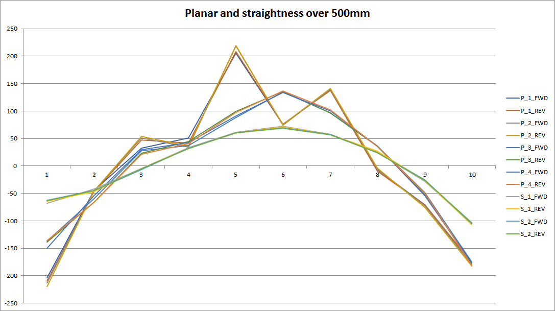 The chart below shows the results, overlayed on each other. You can see at a glance the 4 runs for each test are highly internally consistent but that the results vary considerably between tests 1-3. All are parabolic suggesting the granite island has a parabolic surface error of around 100 microns. The jagged line group is test 1, the slightly lower group is test 2 and the lowest group is the straightness test 3.