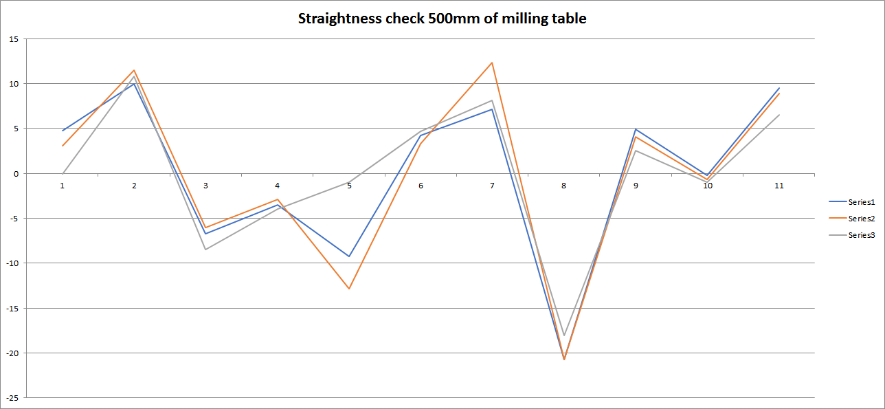 One final test, I repeated the straightness test on my milling machine table, again 10 stations over 500mm, 3 runs again eyeballed off a ruler bolted to the table. The table is pretty straight within +/- 0.01mm over 500mm.