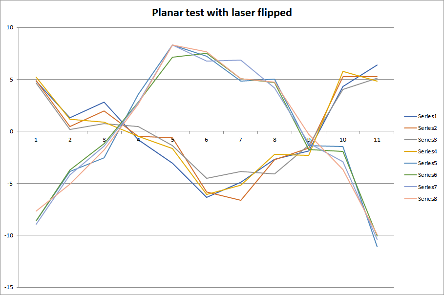 I think this suggests that this laser has a parabolic error in its cylindrical lens or the lens alignment, what do you think? Chart shows all 8 runs, you can clearly see two groups of 4 parabolas, one group the inverse of the other, this parabolic error is greater than any error in table straightness.