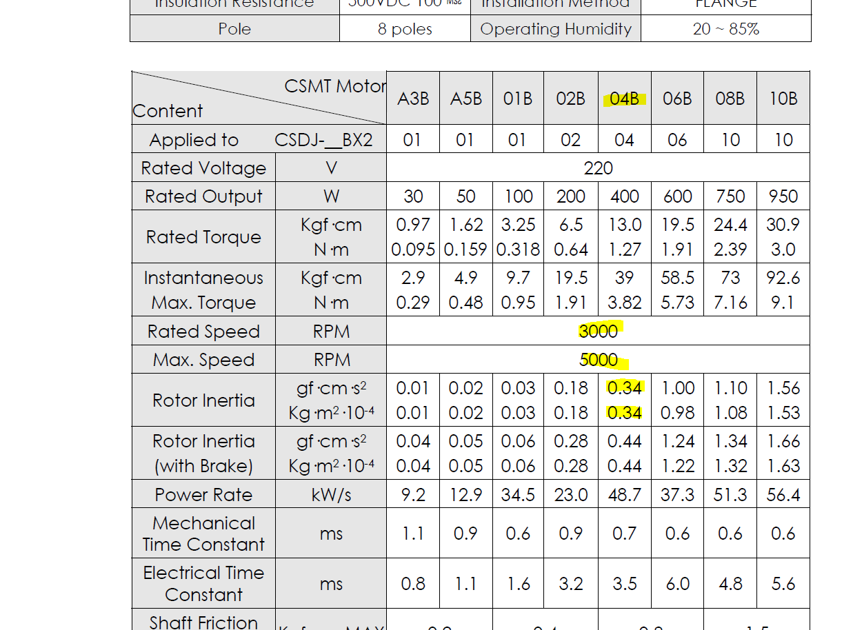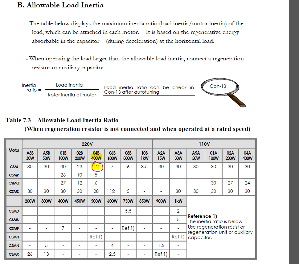 It seems their limit for the inertia ratio is set by the capacitance present in the motor driver dc-bus. When the motors are decelerated, some of the energy stored in the total inertia of the system is transferred into the capacitors, since the drivers are supplied from a simple rectifier which only lets power flow one way. The problem with this is it causes the voltage on the capacitors to rise and if the energy transferred is to high (due to high inertia ratio), the capacitors will be damaged. It's actually quite easy to work out roughly how much the voltage rises, just equate the energy stored in the inertia, . to the capacitor energy, . and re-arrange for voltage. The things we can do to alleviate this problem are add more capacitance, add a breaking resistor to dissipate the energy as heat or reduce the input energy by lowering the system inertia.