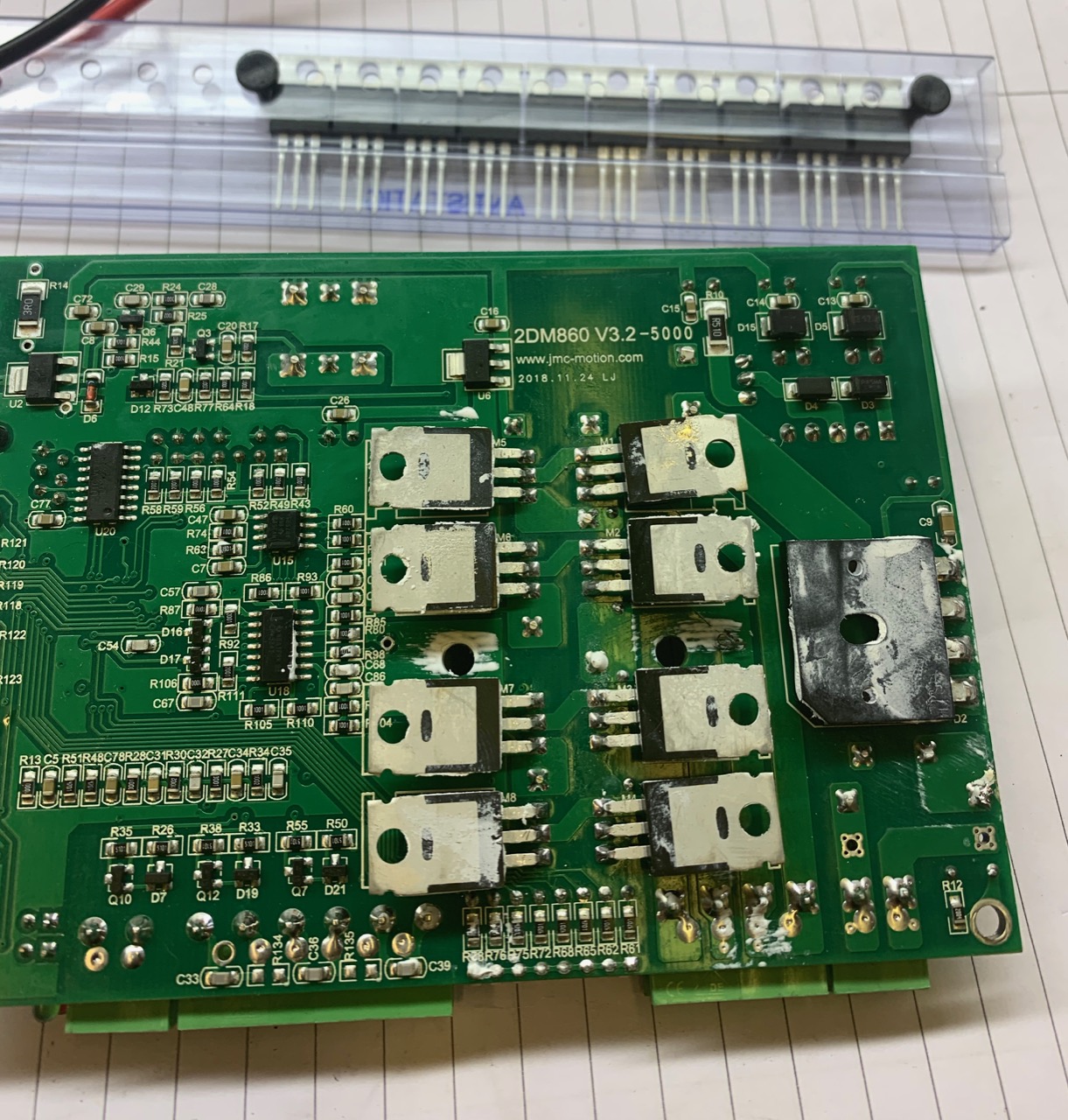 Next apply power (having replaced the fuse), without a motor attached to check that nothing goes pop...