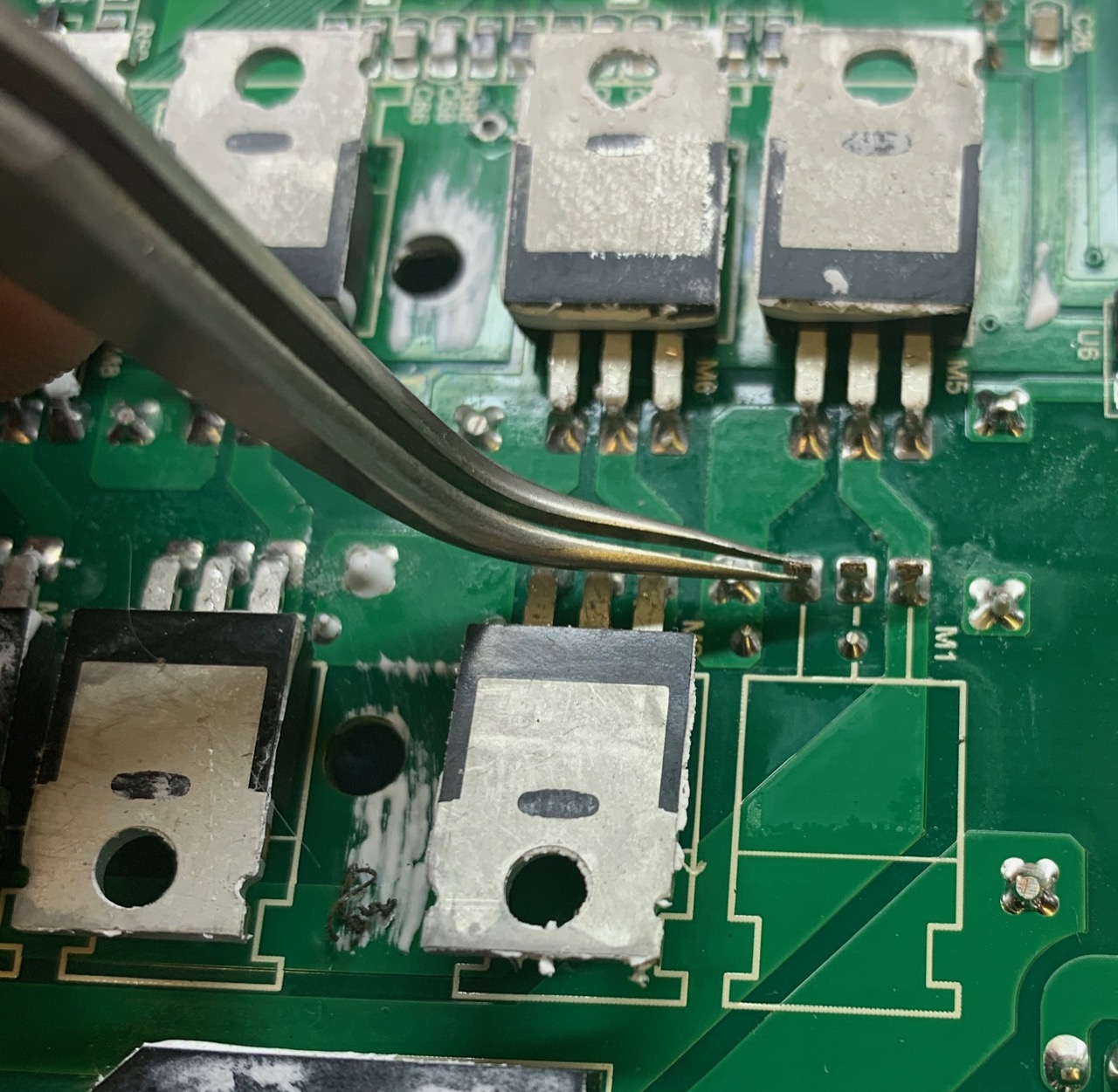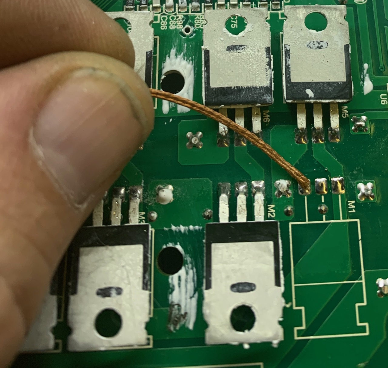Bend and crop the leads of the replacement MOSFETs, insert and solder from the copper side of the board. A quick examination of the component side confirmed no heavy current traces on that side, so no need to risk trying to solder from the component side as well (the access is inhibited with a couple of wire wound resistors).