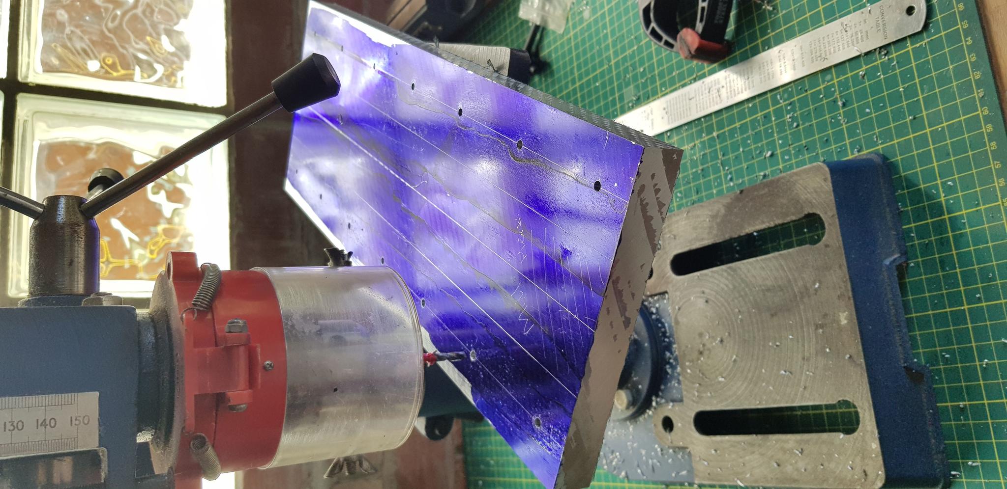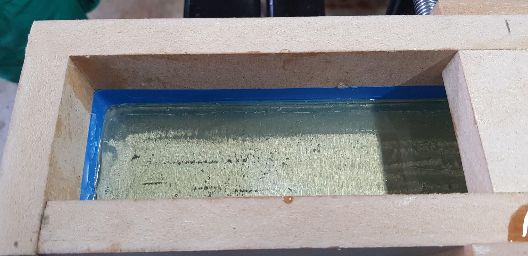 Somehow, we managed to get the epoxy poured (taking shifts on who could hold their breath in the toxic air for the longest, the other running outside for some palatable air). I managed to go round 3/4 of the frame with a scribe and poke a few of the biggest bubbles before it became too gelled to continue, but most of them have left small craters. I'm quite sure the last 10cm or so hasn't been able to level before gelling.