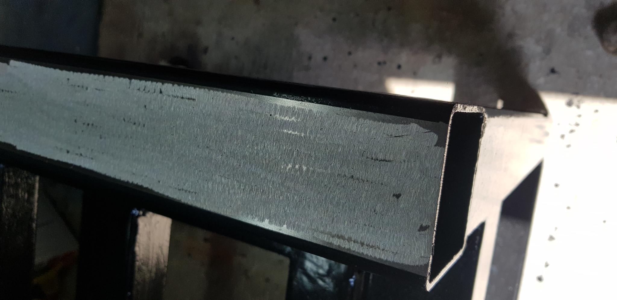 Once my lovely smooth and flat steel beam was level, I then set about mauling it with the grinder. The idea was to give the epoxy something better to stick on to.