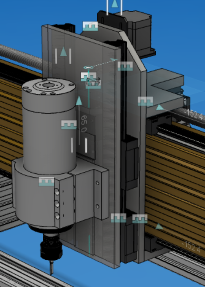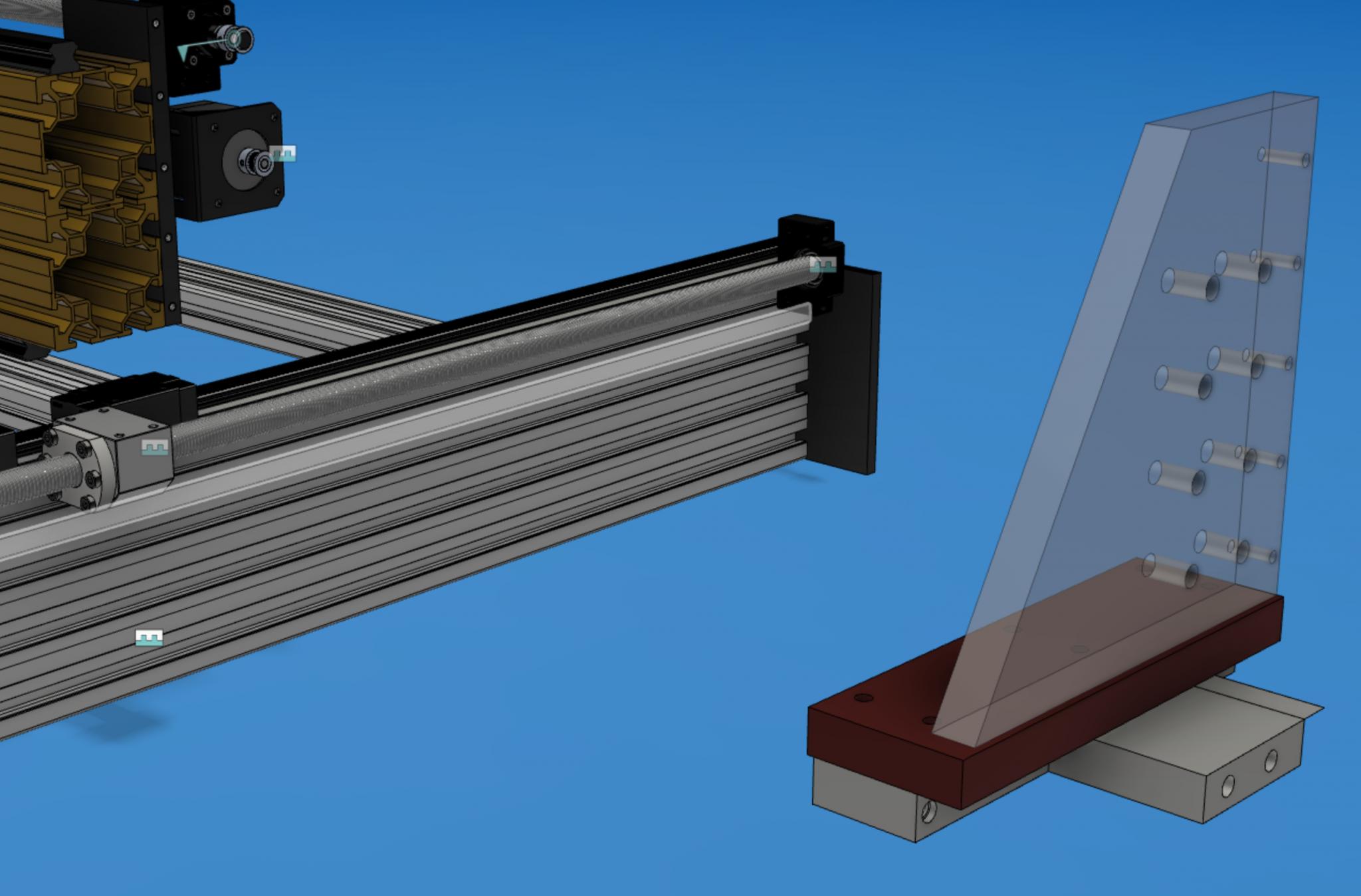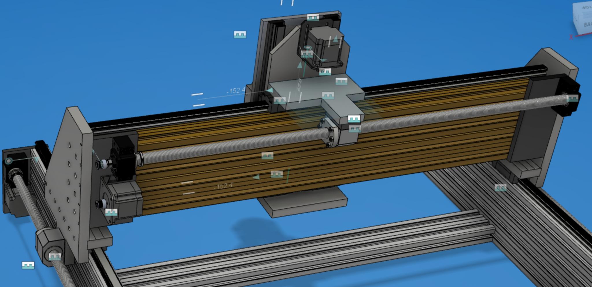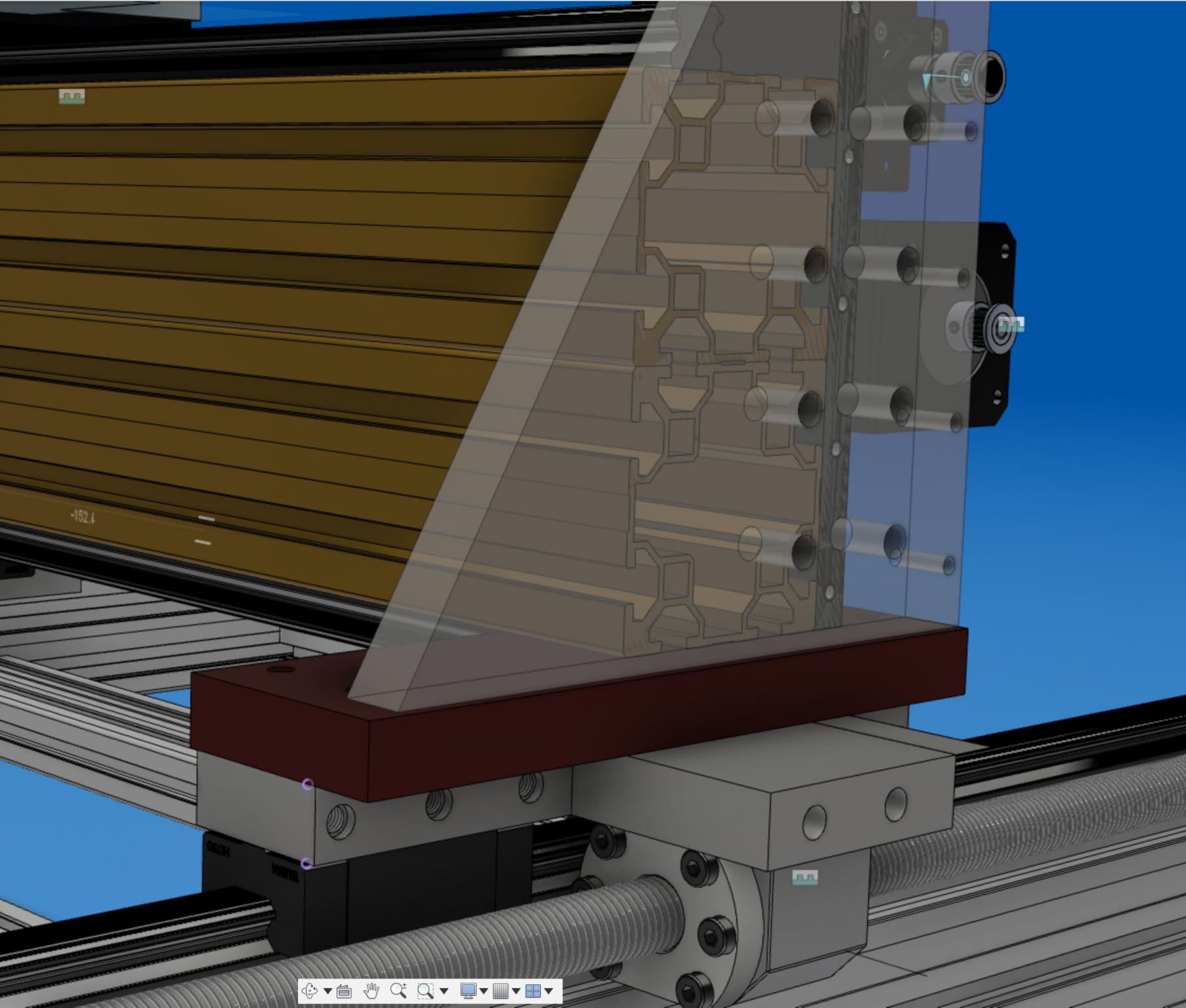 I wouldn't wait too long before adding bolts into your model - the heads can be large enough to change things, and then you might want to think about countersinking them. This ties in with the adjustment Jazz is referring to; there might be places like the Y axis ballnut connection where you want a bit more adjustment room. For example, here I used slots so I didn't have to be spot on on the height of the screw vs the rails. How would you adjust each connection in all three axis? How will you tighten the motor belts? etc.