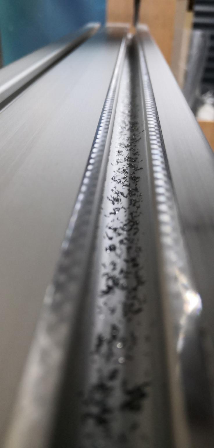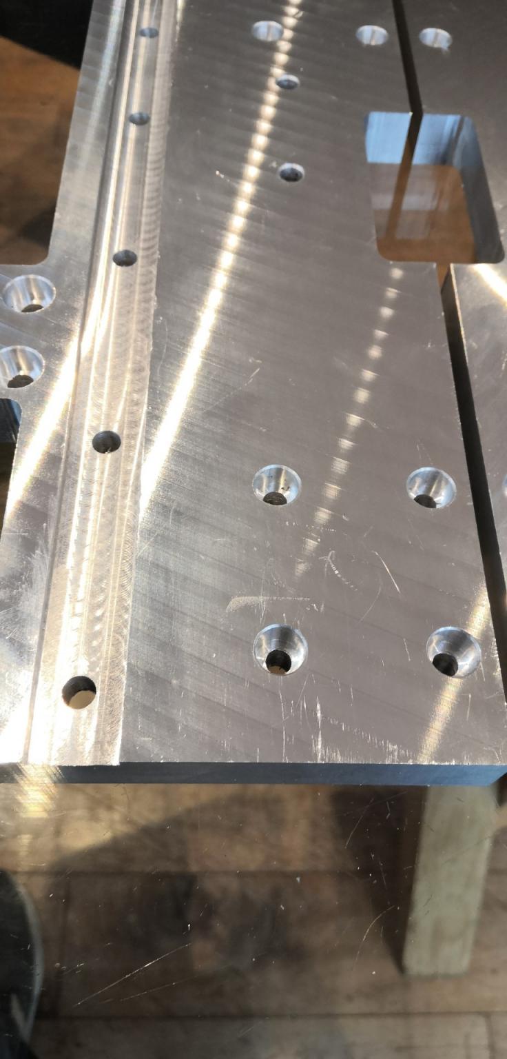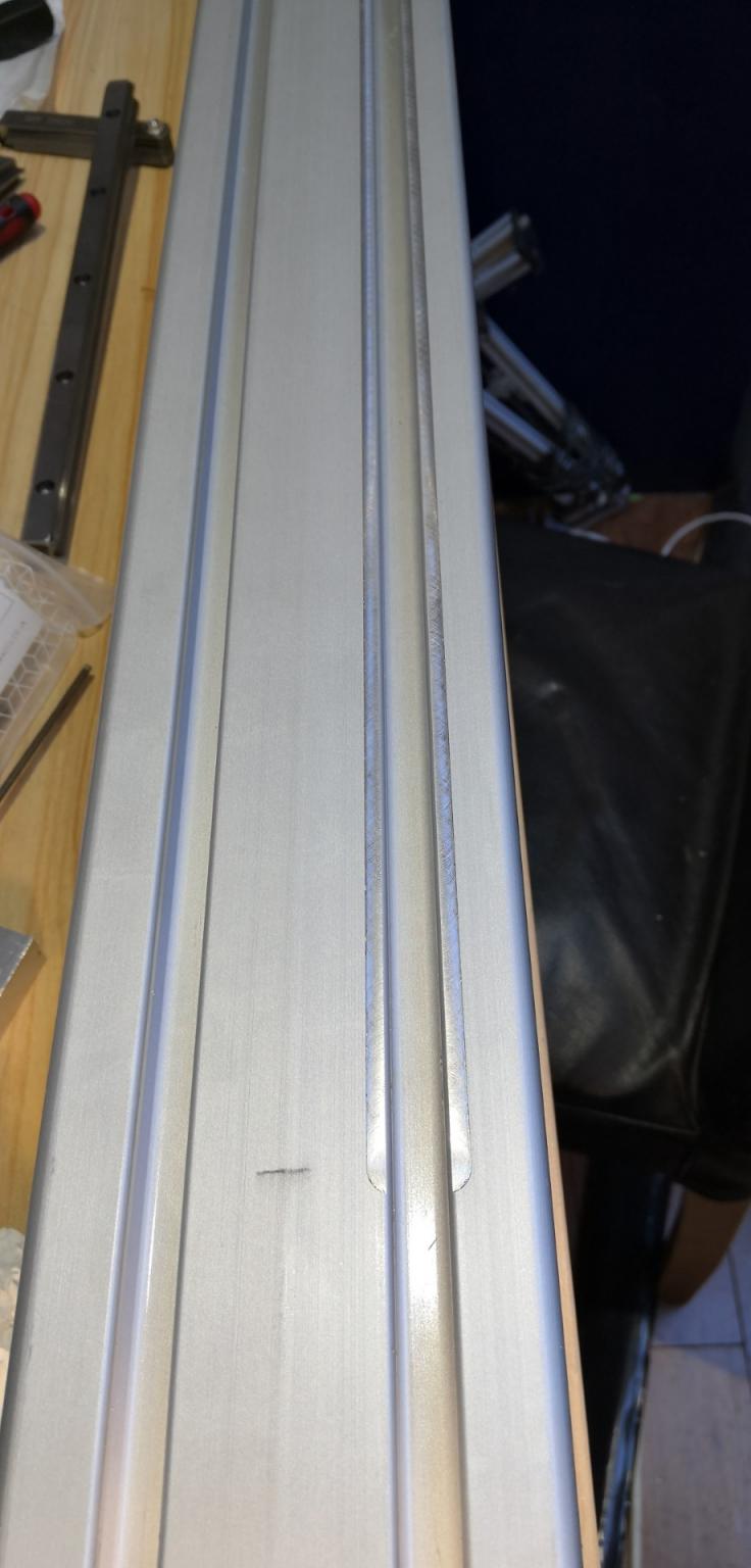 Well I've milled 4mm either side of the slot flat on each side of the extrusion. Setup took a long time making sure everything was flat with the dial indicator, nipping up the gibs to try and counter the sag from the long overhang. I pretty pleased with the result, seems at least as flat as the extrusion. I need to get some rails mounted to it and make the Y bearing plates so I can see if it is sufficiently parallel to be usable. DOC was about 0.25mm with a carbide endmill, could feel it was cutting deeper on the outside due to the increased slope as discussed in the previous posts.