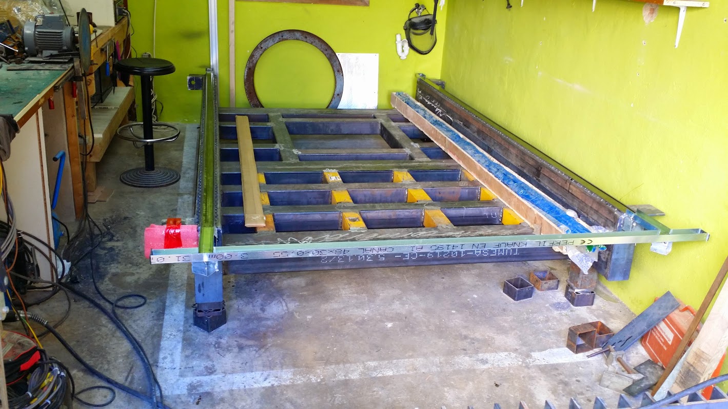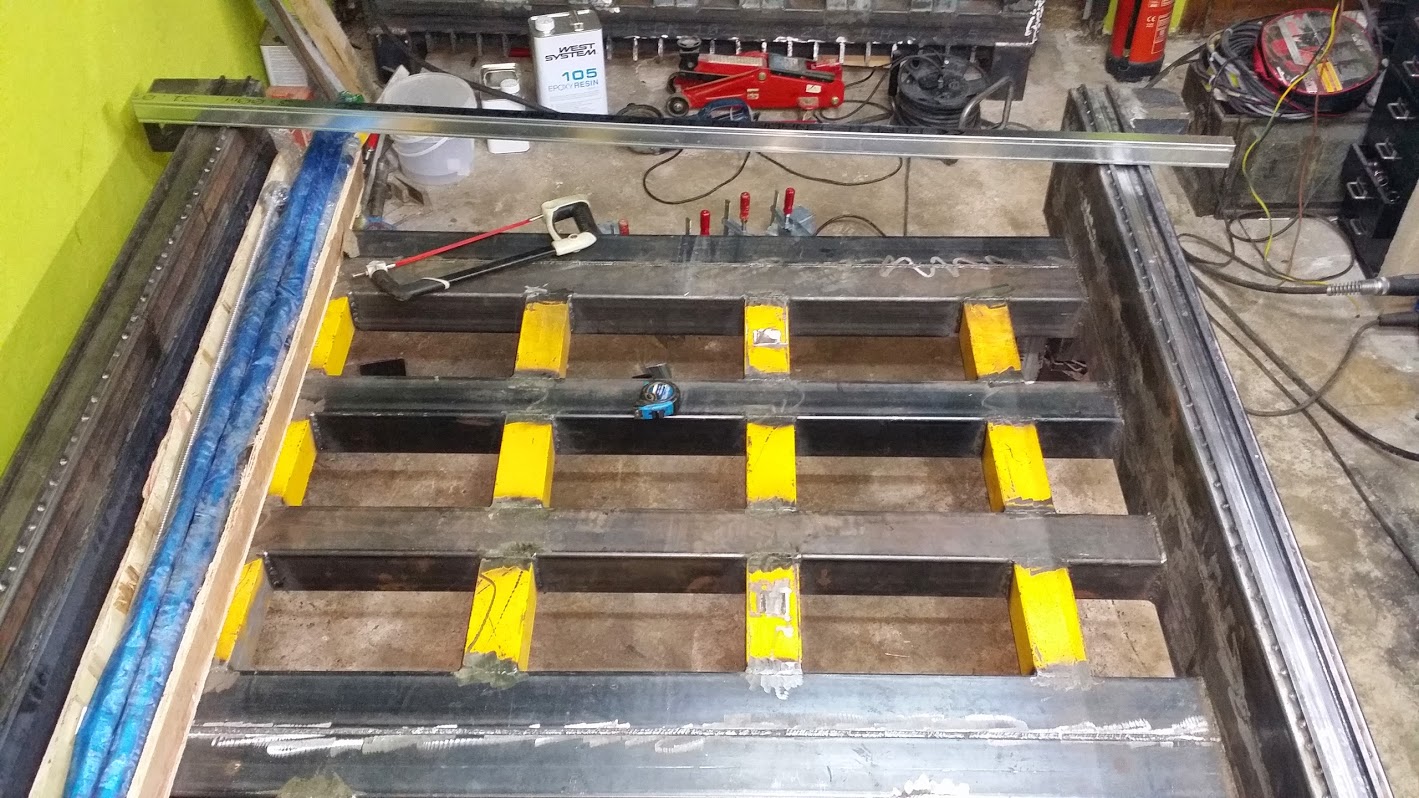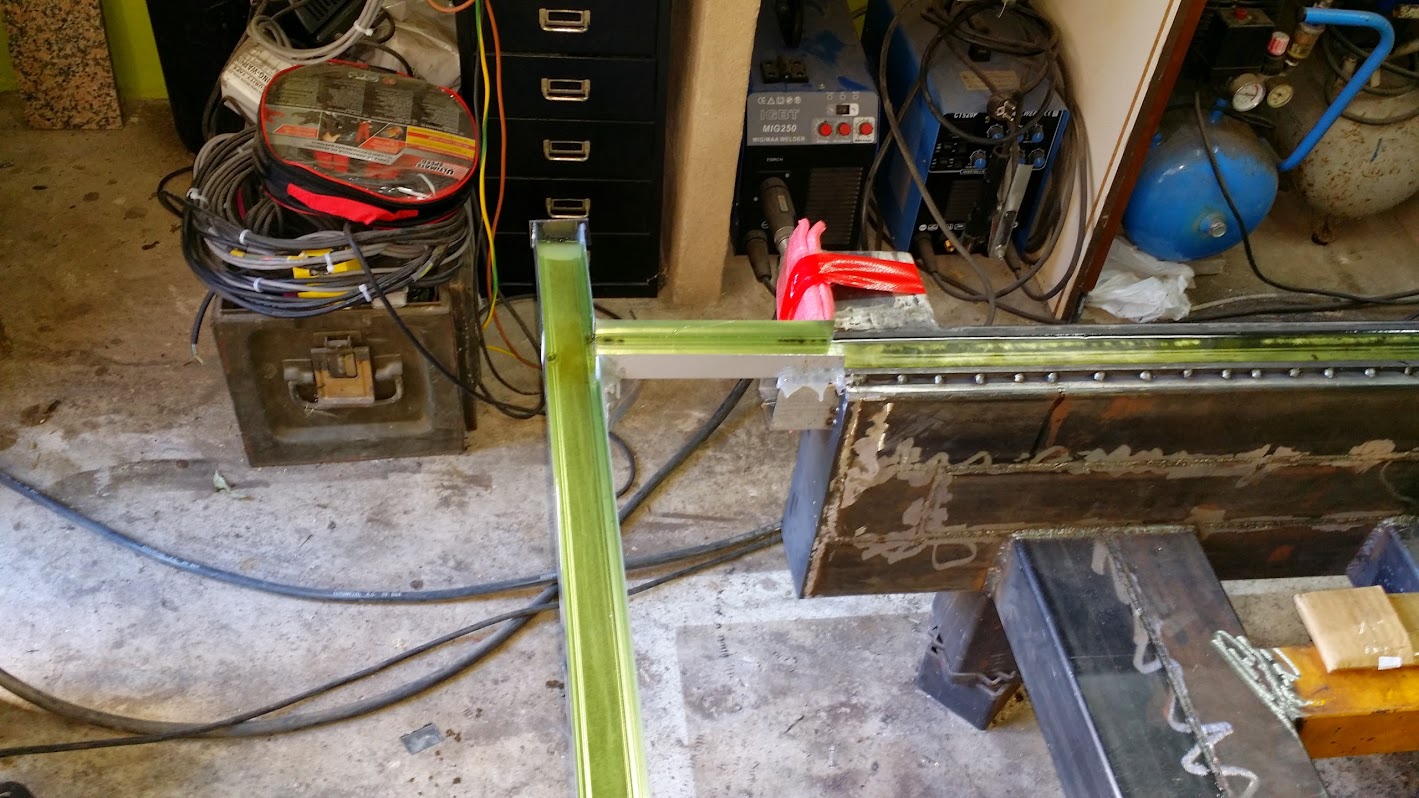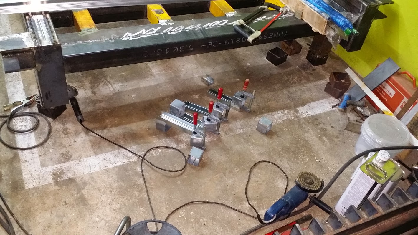 So as all was mounted together maintaining that precision i laid it down carefully on top of the back Z plate. Now as you can guess the Z plate was not perfectly flat. So i spot welded the side plates/together with the aluminum assembly/ to the Z plate, but only at one side that so the previous assembly is square left right. See pictures above. I used also some clamps not to let it twist left right. Then i force clamped all down to the steel back Z plate , so now it was square and flat / cause the steel side plates wer cut by laser 0.01mm , remember? and i have mounted them perfectly flat against flat plate/ .
