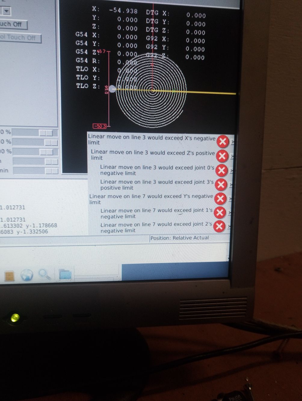 At a quick glance, that looks like a soft limit problem. When you configured LCNC you should have set up min and max limits for each axis, and those error messages say that you are trying to move beyond one (or more) of them.