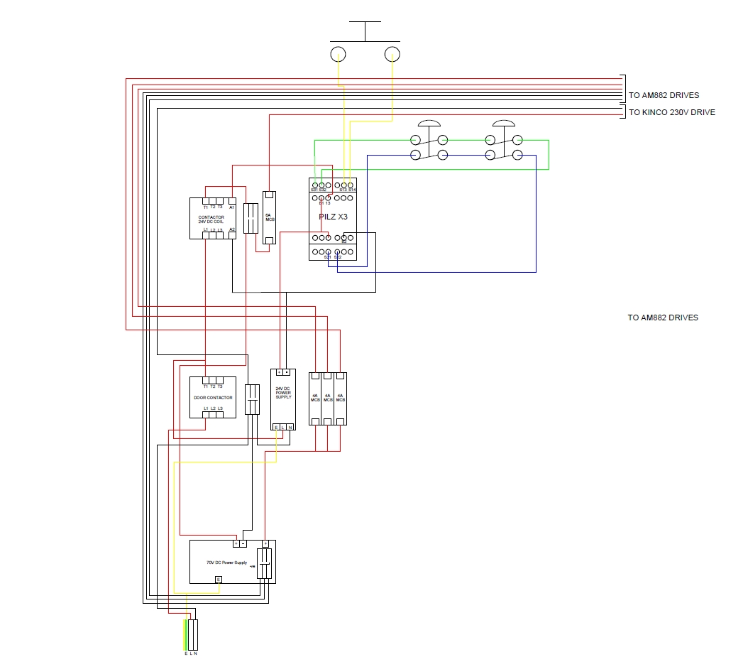 Neil bit hard to read these schematics but looks to me on the power and Safety diagram you got something wrong.?