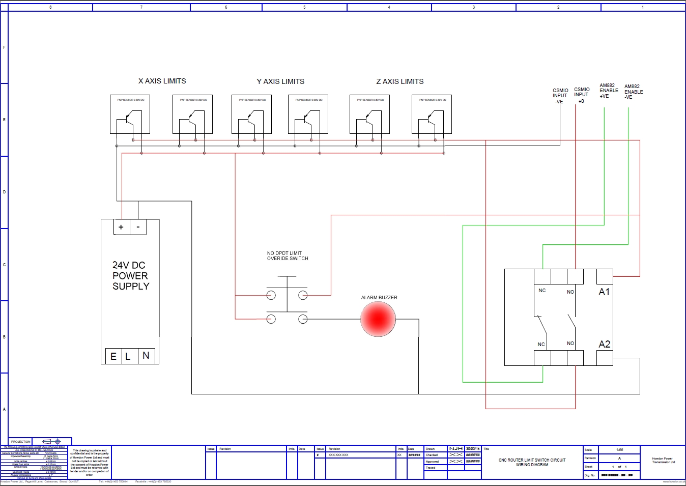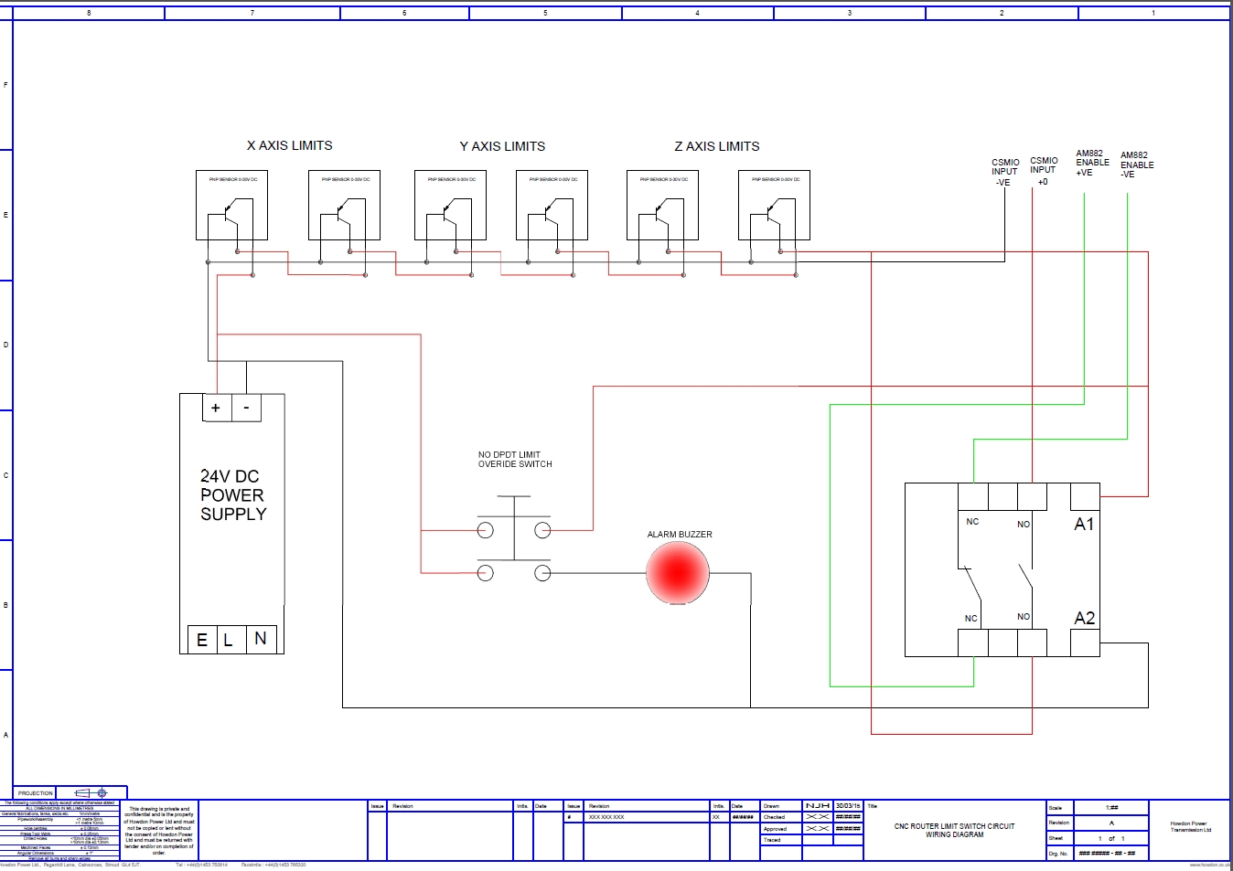 Graeme, sorry, I've deleted one too many lines, there should be a line to the A1 of the contactor giving it power from the common line of the sensor. The way I am seeing it is that the contactor is NO until 24V is put on to the coil then it closes the contacts hence making the circuit, the enable is then open which means it's unconnected and enabled and allowing the drive to send pulses to the stepper. Any sensor being activated will break the circuit and the limit switch overide will need to be pressed to put power back on the contactor so I can back the machine off the sensor. Pressing the overide switch will sound the warning buzzer.