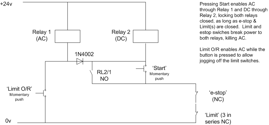 Using my imagination I've imagined some of that same 24v running thru E-stop going thru limit switch's as well and the RL2 relay having another contact for the 5v signal from BOB.!!