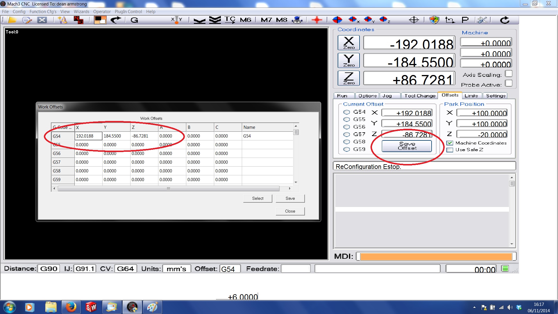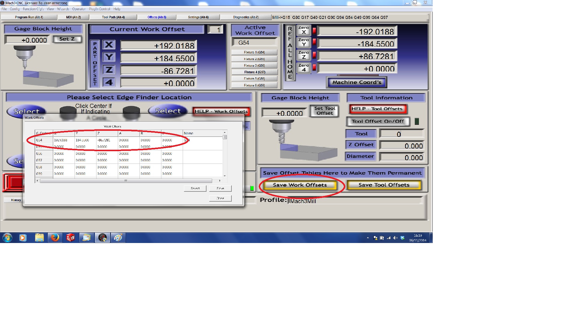 Save the work offset. On the Standard Mach 1024 screen set you'll find it OFFSET's Tab on lower right under SAVE WORK OFFSETS.