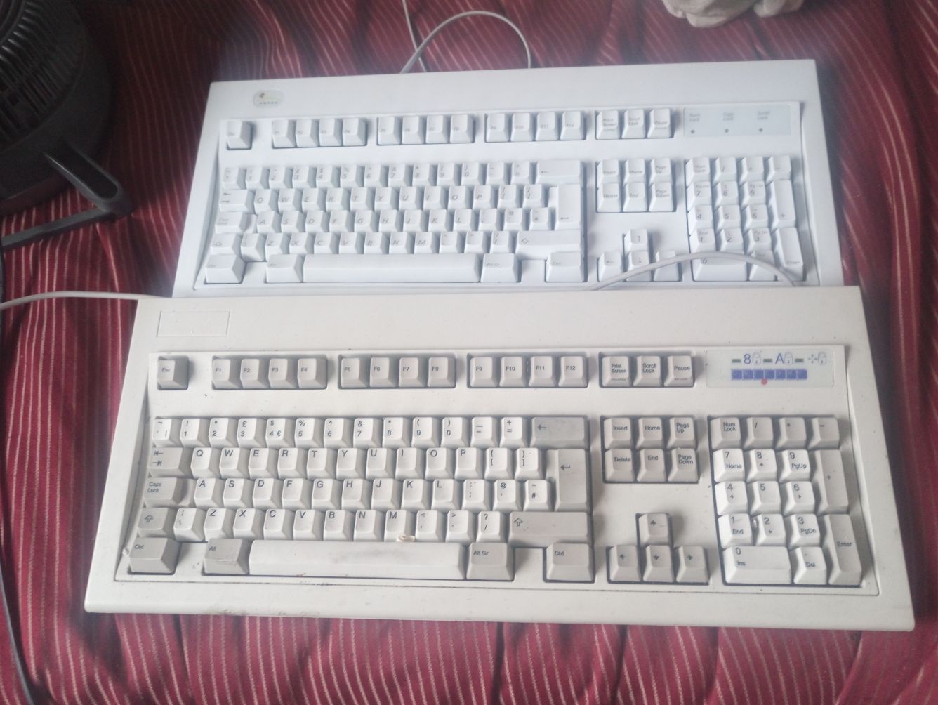 The top one is 25 years old! IBM used PBT which doesn't yellow (Although there are some rare ABS examples) so the keyboard looks new even after 25 years of use! It does have loose plastic rivets so I need to strip it and bolt mod it a common problem on the old model M keyboards. The white one is an Ambra keyboard made by IBM and branded Ambra (Which was meant to be their budget range only lasted 1 year, mostly because they didn't change anything so it wasn't very budget lol) which may be why it has white caps. Unicomp still make model M's to this day and I got the classic IBM style keyboard so it comes with classic keycaps.