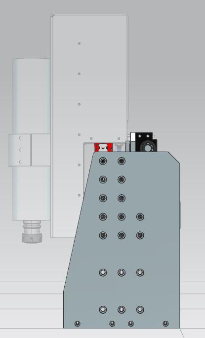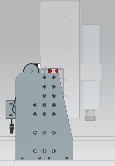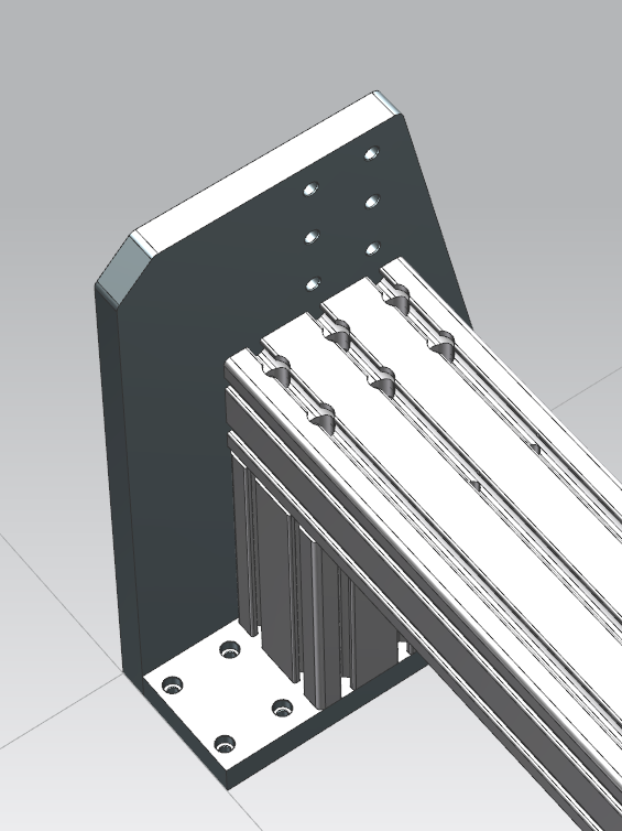 - 20mm aluminium gantry side plates, bolted to both the L-section and the high side gantry profiles. It is also bolted to the bottom plates, that will be mounted to the Y-axis bearing plates. The purpose of the bottom plates being separated from the Y-axis bearing plates, is to allow some adjustment later when squaring the gantry.