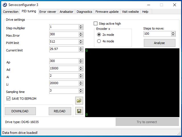 EDIT - that's annoying. I seem to have logged almost everything else I ever did on this machine but there's no trace of the PID settings in the servo tuning. Sorry about that. I seem to recall that you could plot the response in the software as you played with the numbers.