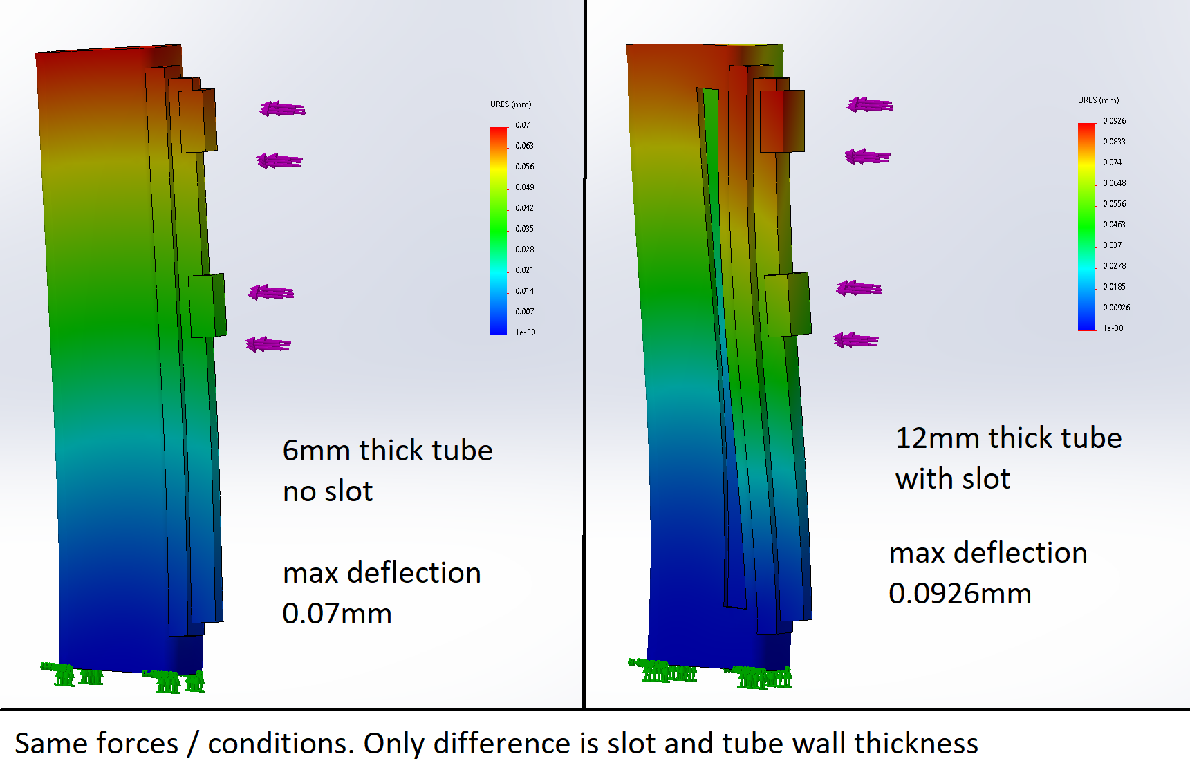 (If you put the slot in the opposite side of the tube, away from the rails / load, deflection is roughly in the middle between 'no slot' and 'slot')
