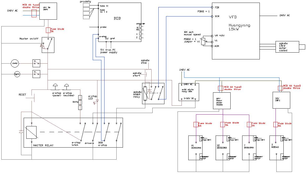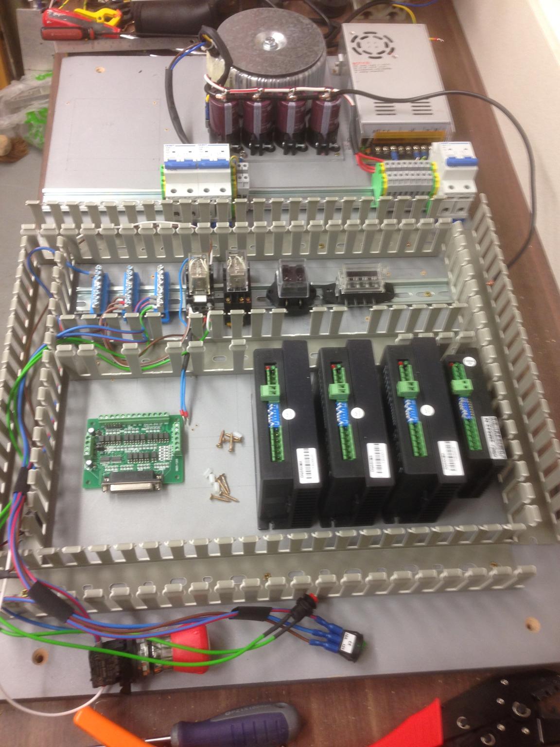 This did get my thinking though about the voltage that the 12V DC relays would be switching across their terminals, and I wondered about the lifespan of the contacts. This coupled with the fact that if I e-stop the machine then there would be 70V DC floating around in the control box. So, the relays all came out and the drivers will be hardwired to the PSU. This solves both problems in one.