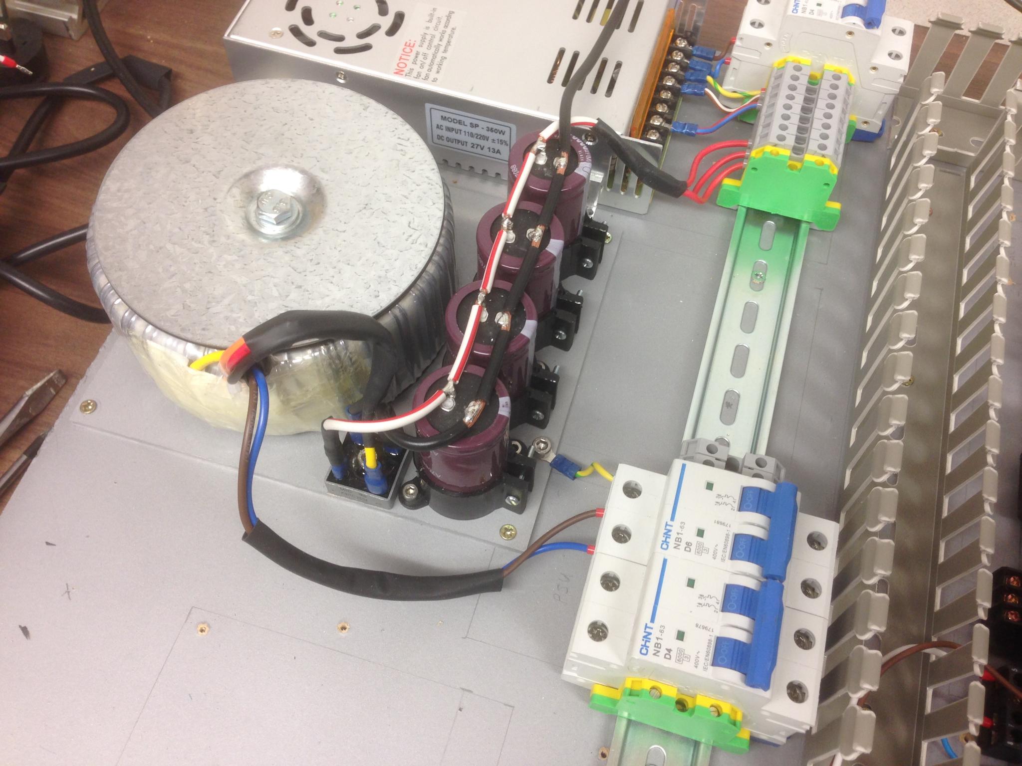 The power supply has been wired up correctly (!) - still need to split out the black 0V cable into 3 feeds and tidy up the general wiring but otherwise PSU is nearly done. As reported previously it all works.