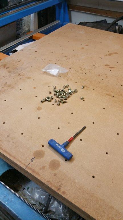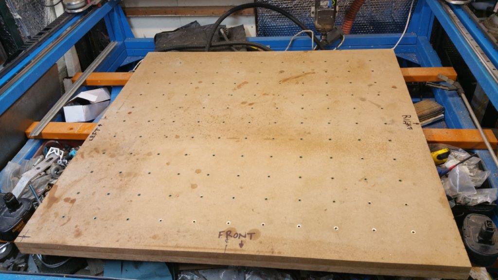The spoil board is 28mm MDF cut in half and put on top off itself so the picture show it at 4ft x 4ft. The holes were plugged with 6mm threaded inserts which will be used to hold down the material to be cut. The whole lot will be fixed to the orange metal as seen in photo so as to be able to be leveled up as needed.