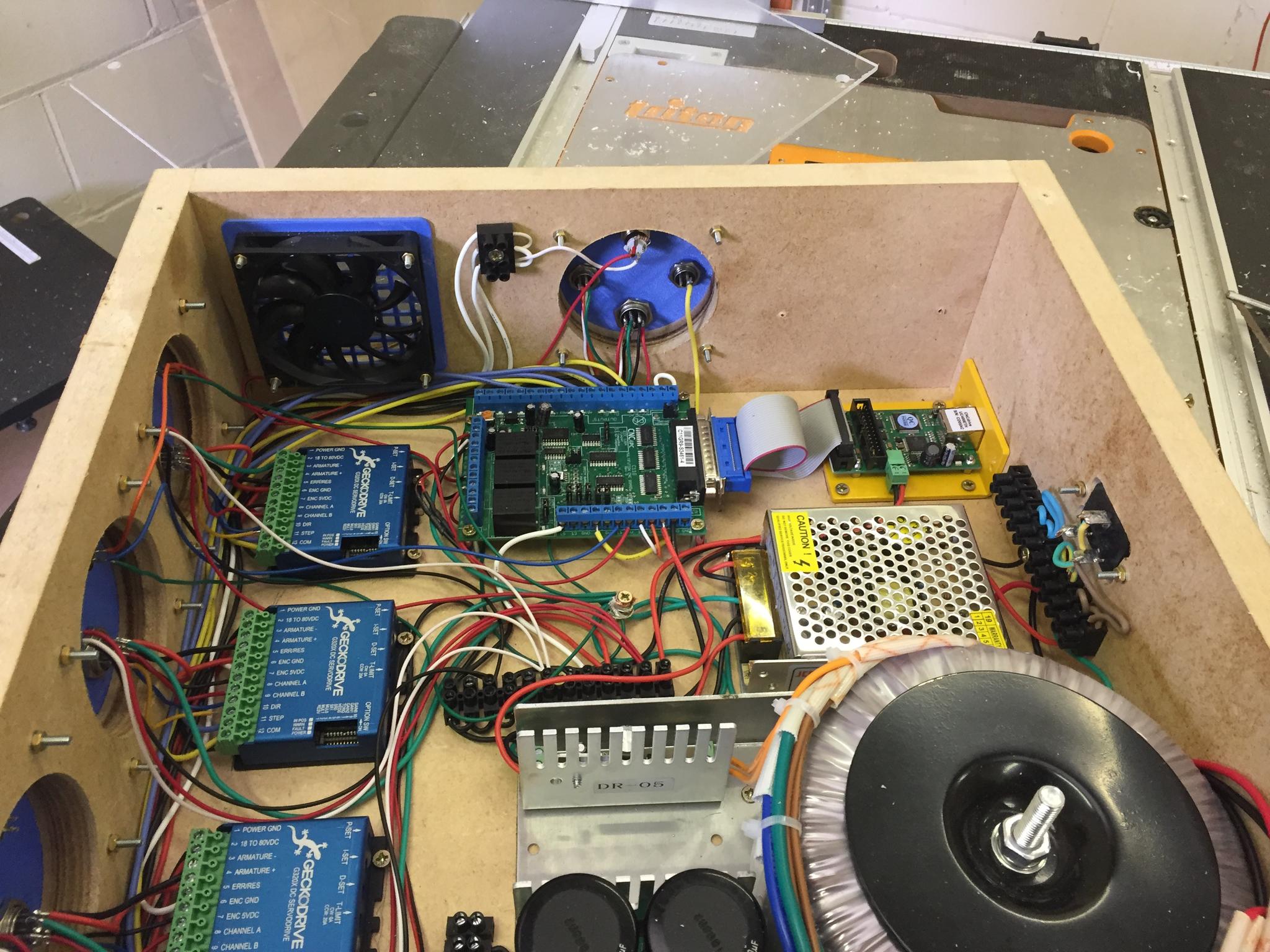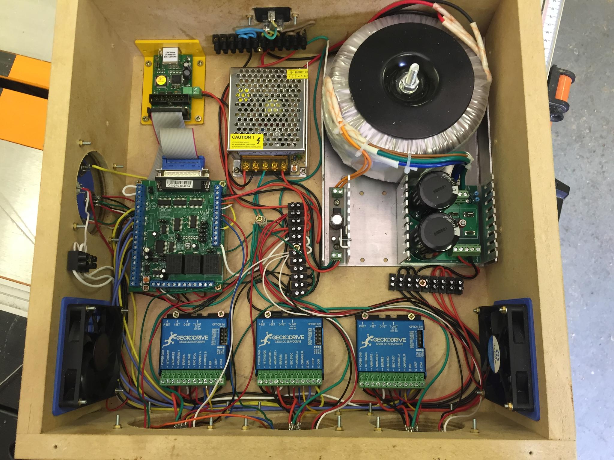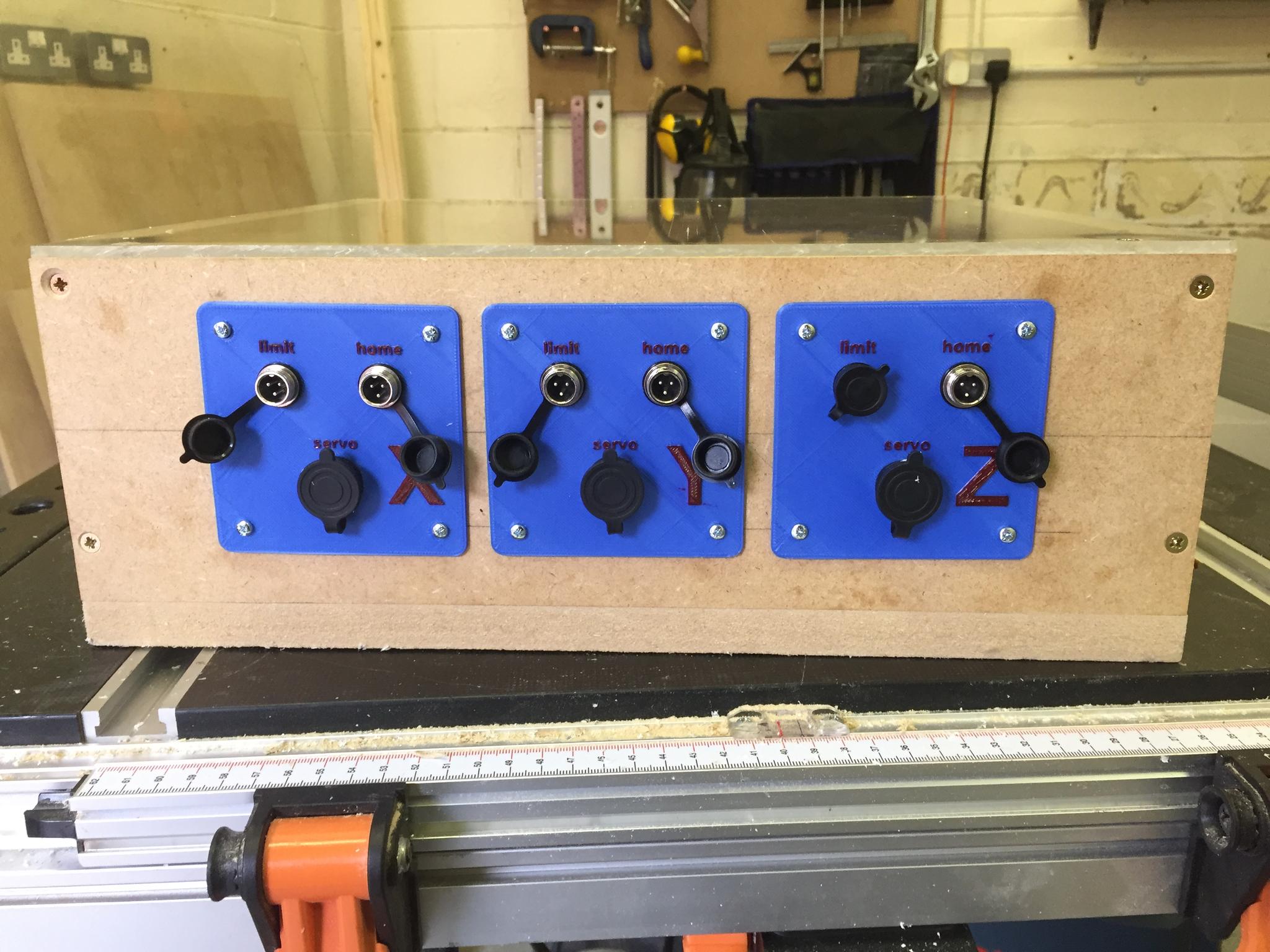 1) Made a simple 400x400mm MDF enclosure for the control box. 3D printed some connection panels so I can change the interface in future if necessary. Bit of spare clear acrylic for the top.