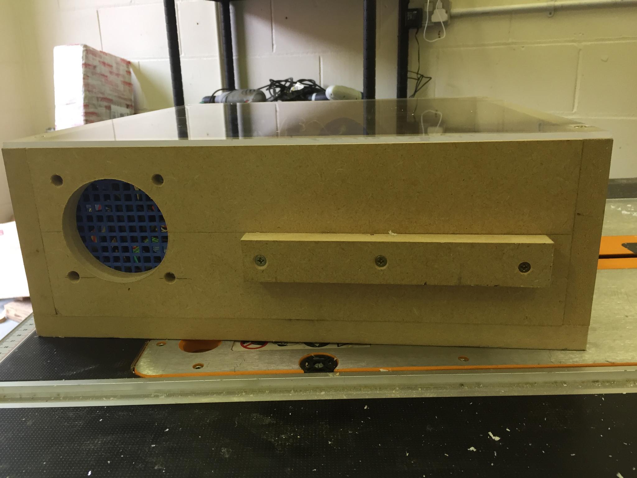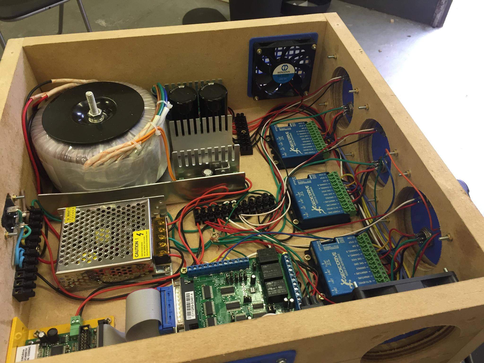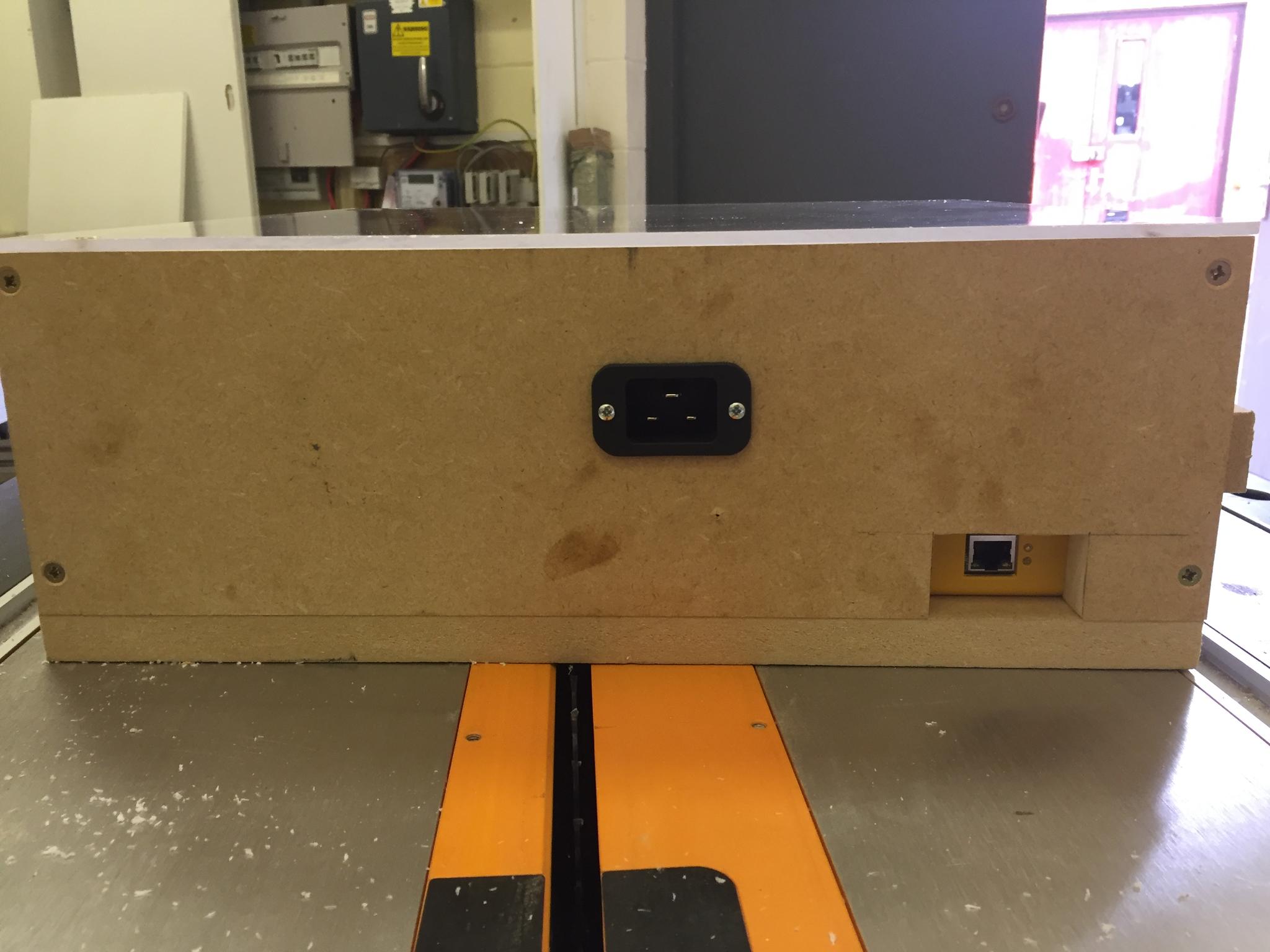 1) Made a simple 400x400mm MDF enclosure for the control box. 3D printed some connection panels so I can change the interface in future if necessary. Bit of spare clear acrylic for the top.