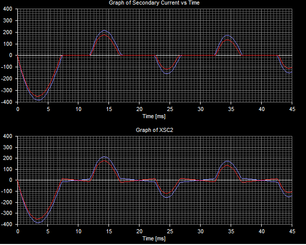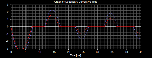 Going back to me previous point about the power supply, I just ran the simulation again but this time with both configurations. The first graph is with the windings connected in parallel on the DC side and the second graph has them connected in parallel before the rectifier: