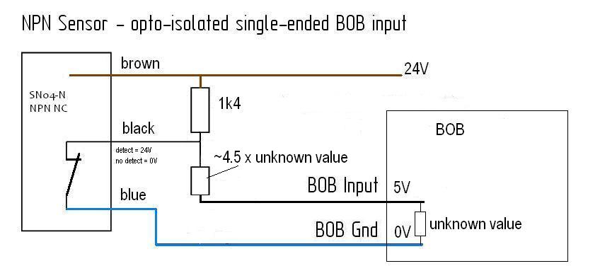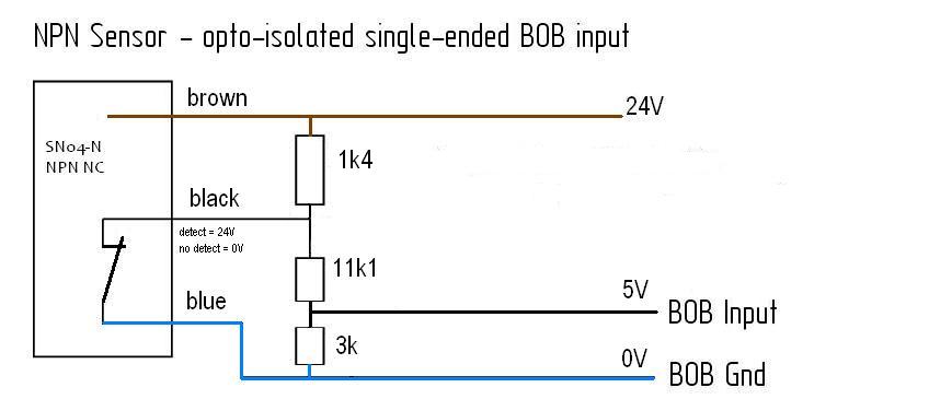 Depending on the inputs to your BOB you have two simple options. If the input is connected to an opto-coupler then connect the anode to the BOB supply voltage (5V) and connect you proximity switch output to the cathode (may need to add a series resistor if BOB does not have one). If the BOB has a logic type input then simple connect the proximity switch output to the input. You may need to add a resistor between input and BOB supply (5V) if one does not already exist on the BOB.