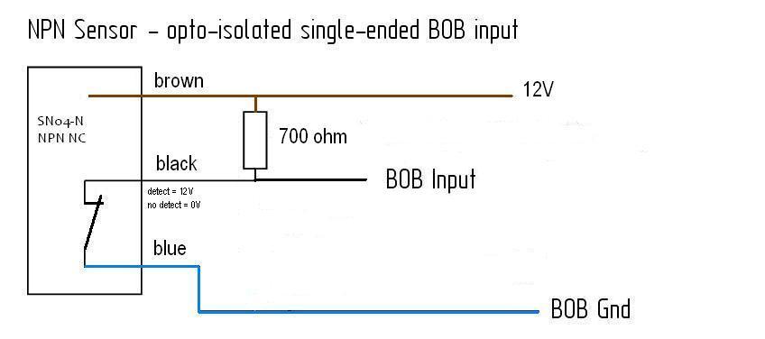 I rigged one up on the bench (at 12V for now), with a 700ohm resistor between brown and black, then checked the voltage between black and blue. Got 12V or 0V when a metal plate was present or not.