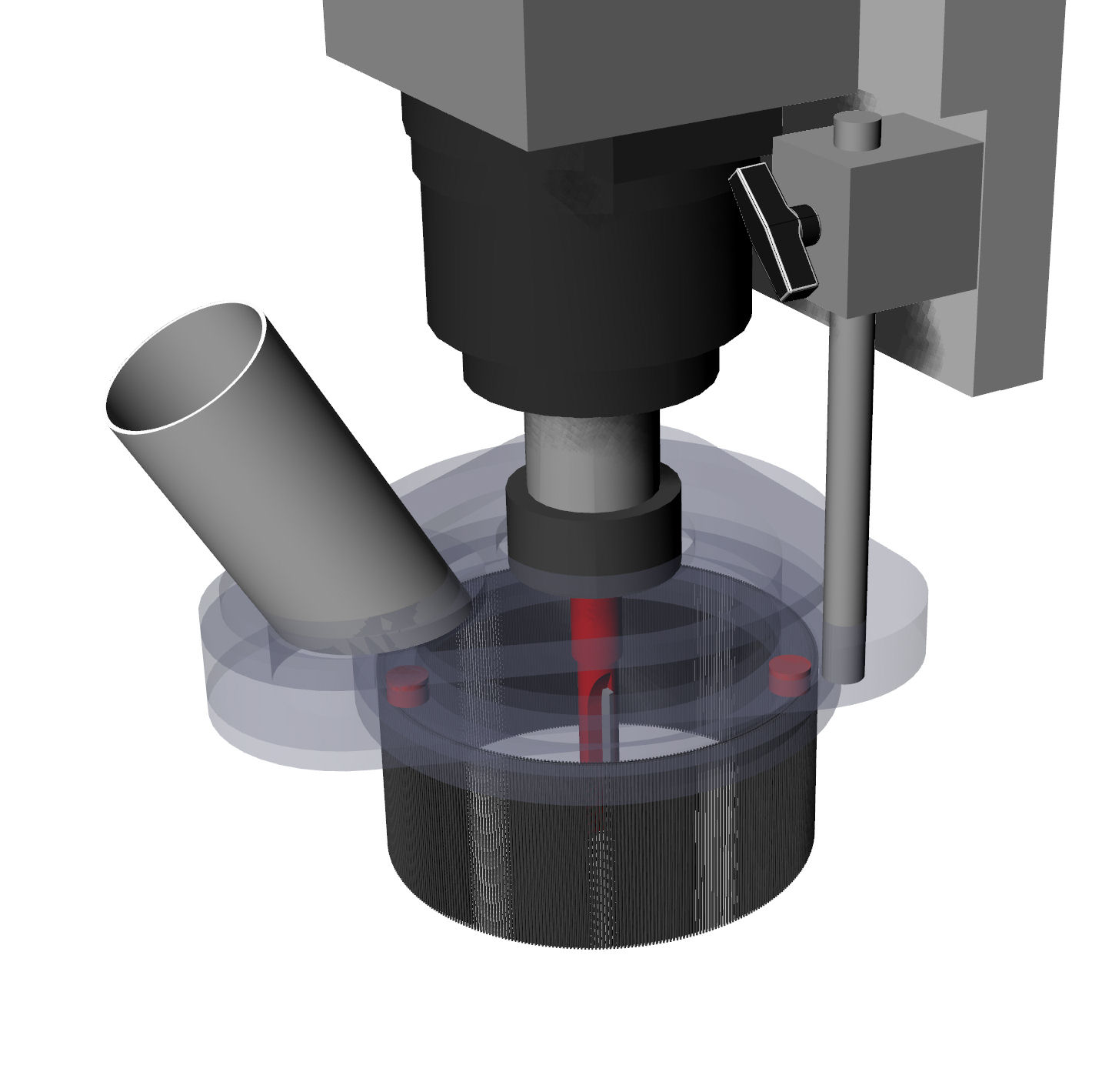 I wanted it to be adjustable so the bottom of the skirt was flush with the bottom of the cutter, or thereabouts. It's not so handy that my spindle does not have a rounded body and has air exit holes at the bottom for the top mounted fan exhaust. Skirt held on with 3 pairs of magnets, allows easy access and different length skirts to be used, mini, knee length, evening gown.