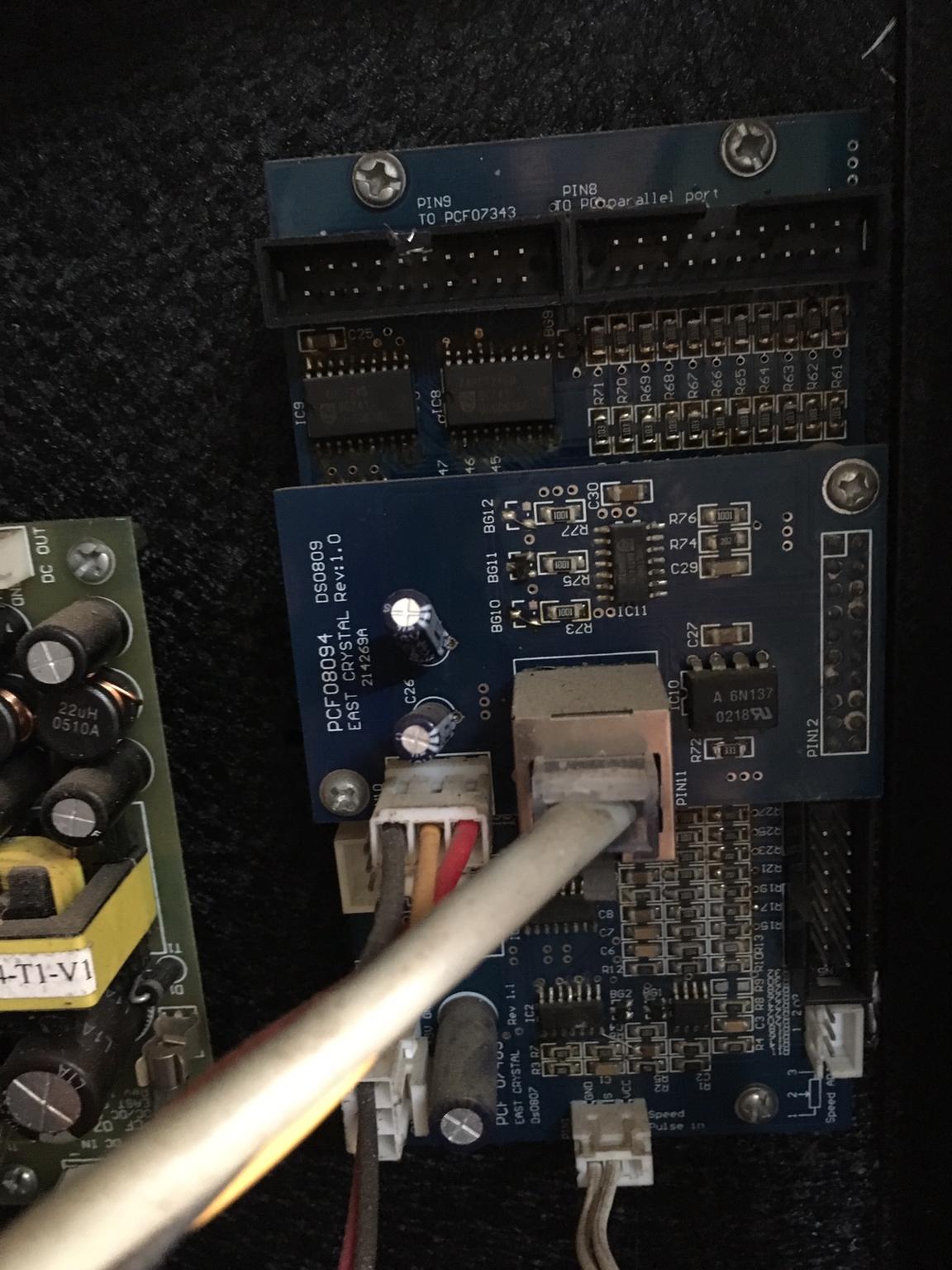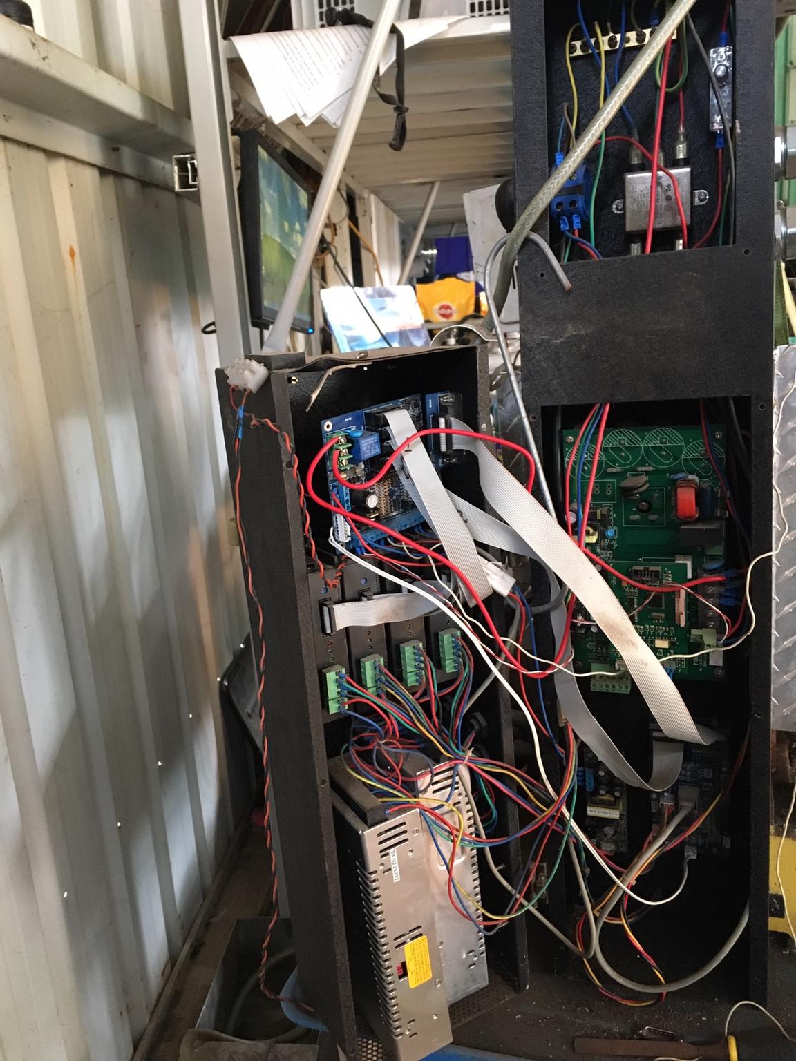Ok nowhere do I see a Parallel port cable but I do see an Ethernet Cable going to what looks like a Controller board with ribbon cables going to Breakout board so are you sure it's using Parallel port.?