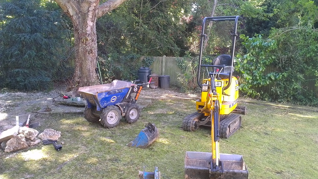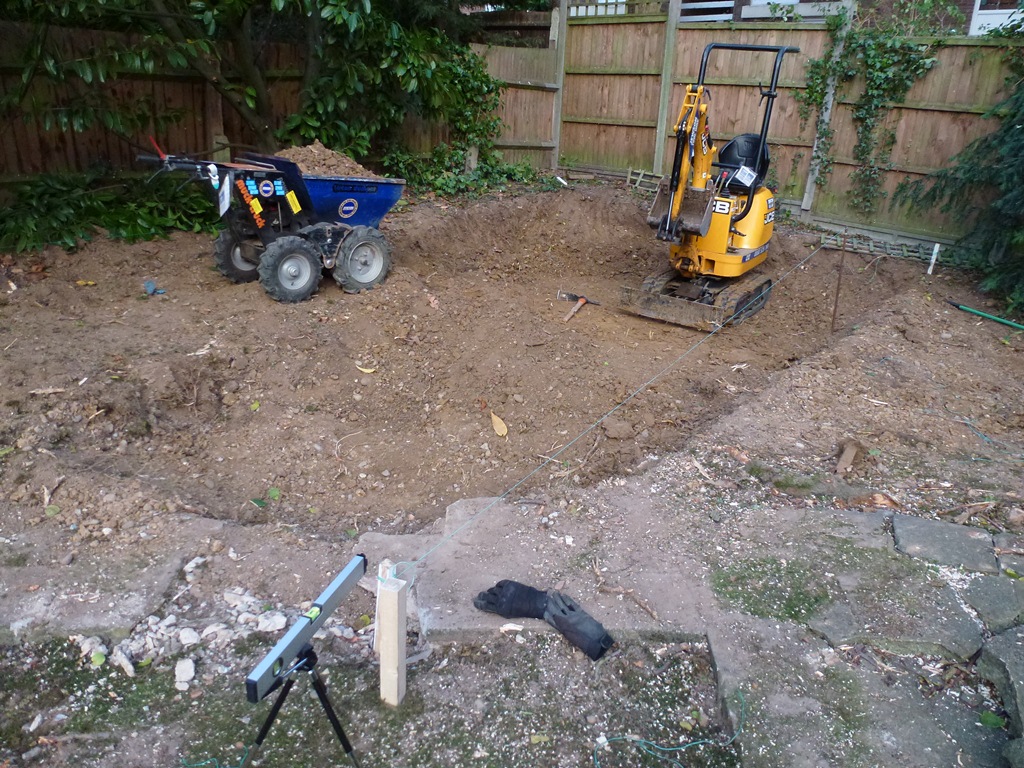 Well end of day 1 and not entirely to plan. Digger didnt turn up til gone 10 but I'd spent the first couple of hours chopping up a crazy paving path that cuts across the corner of the dig. With a cold chisel, a 5lb club hammer and the bosch power chisel... hard work... if I'd known how difficult I'd have hired a kangol but i would have only needed it for an hour or so... then the Muck Truck (powered wheelbarrow) got stuck in the garage back door.. the gap was 705mm the muck truck was supposedly 680mm... yes apart from the hubcaps which needed another 30mm, so had to take the door off...