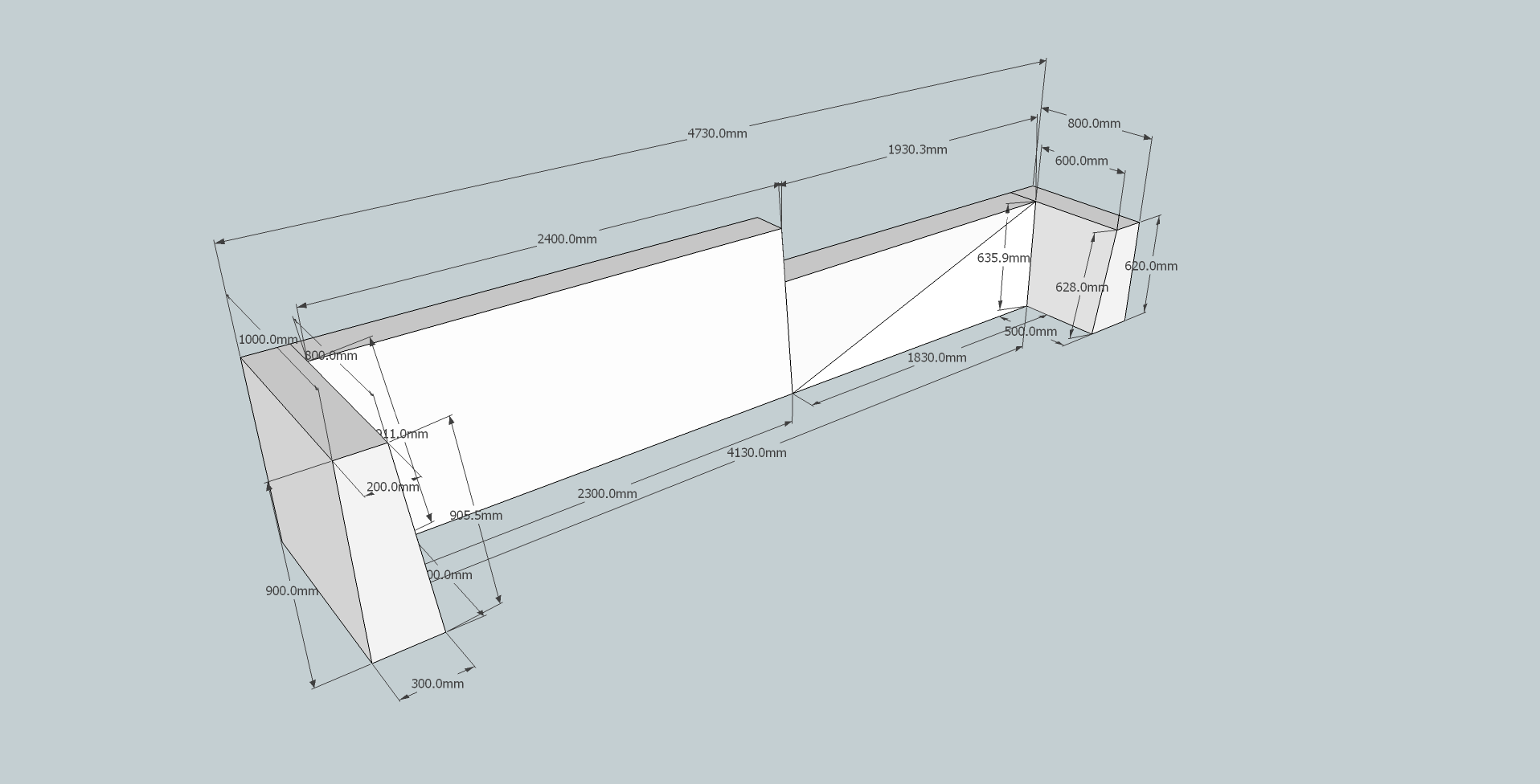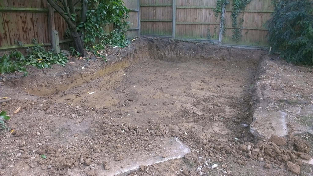 This is before I cleaned it up and tidied the edges... its 6.34m x 4.14m and 275mm deep in the nearest corner, 800mm deep at the far lh end. The bottom is flat to within 3cm which I reckon is good enough.