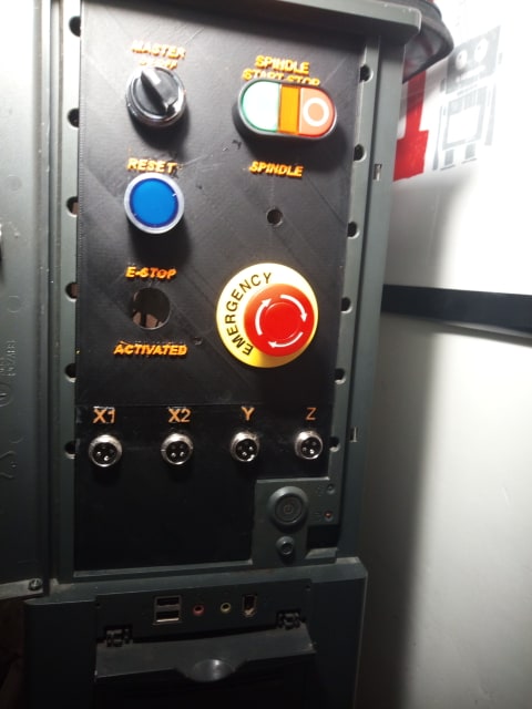I am thinking to place the emergency stop at the bottom right ,since there is the right hole for the switch and scrape the e- stop letters from the bottom left hole?